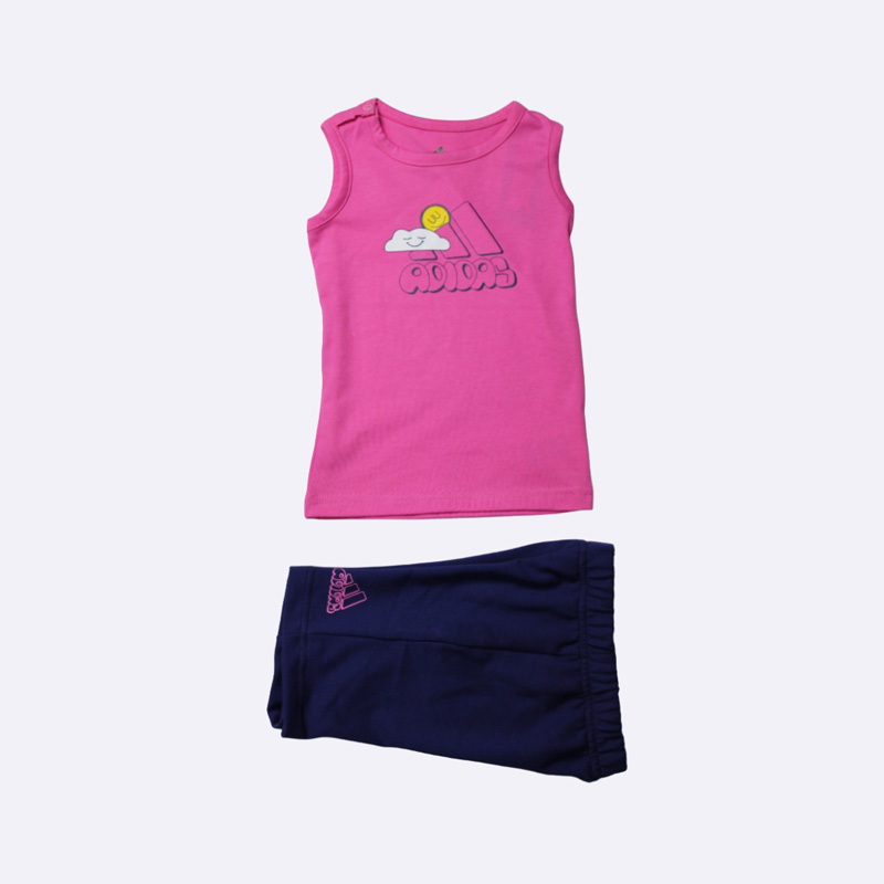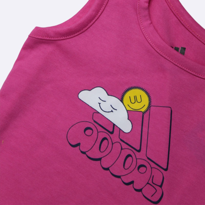 طقم بيجاما بناتي مريح وجذاب من أديداس، باللون الزهري للبلوزة ولون كحلي للسروال. يتميز بتصميم مرح برسوم كرتونية وشعار أديداس. مثالي لنوم هانئ ولعب ممتع