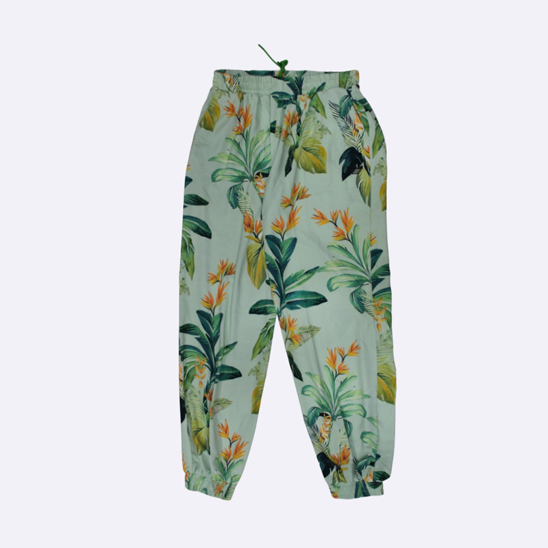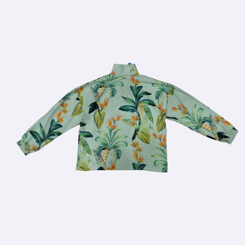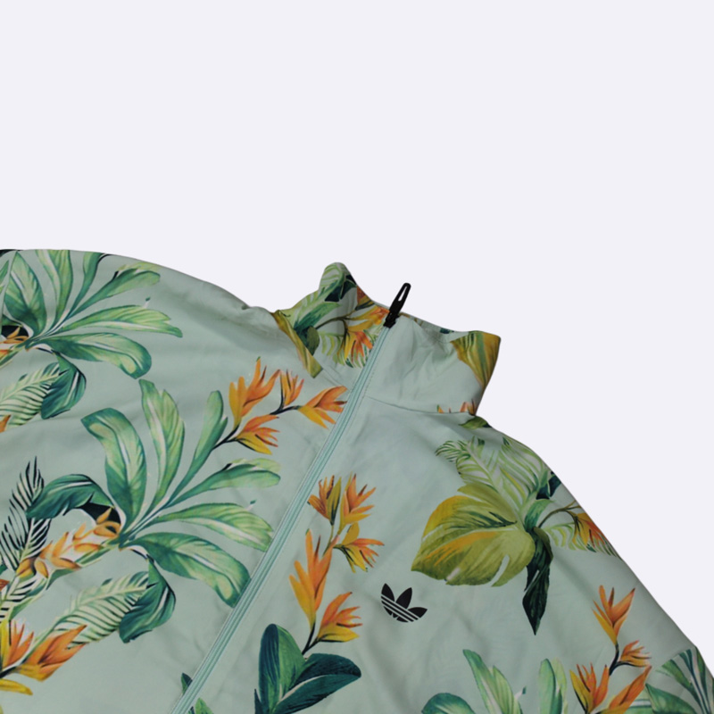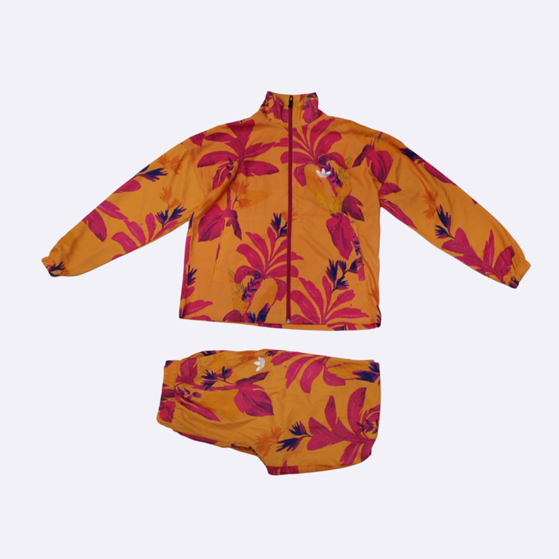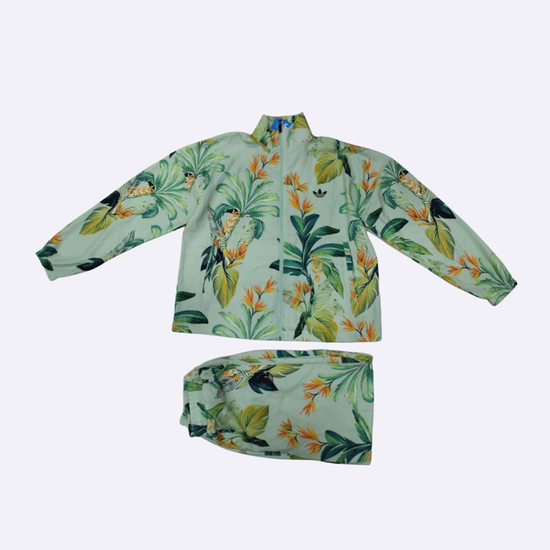 طقم بيجاما نسائي مريح وأنيق من أديداس، يتميز بطبعات استوائية ملونة وجذابة. يشمل الطقم جاكيت وسروال، مثالي للاسترخاء في المنزل أو للإطلالات الكاجوال.