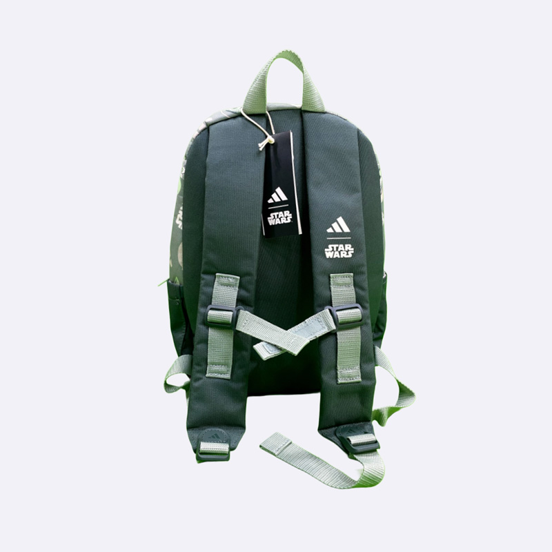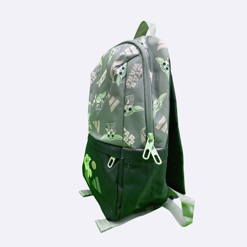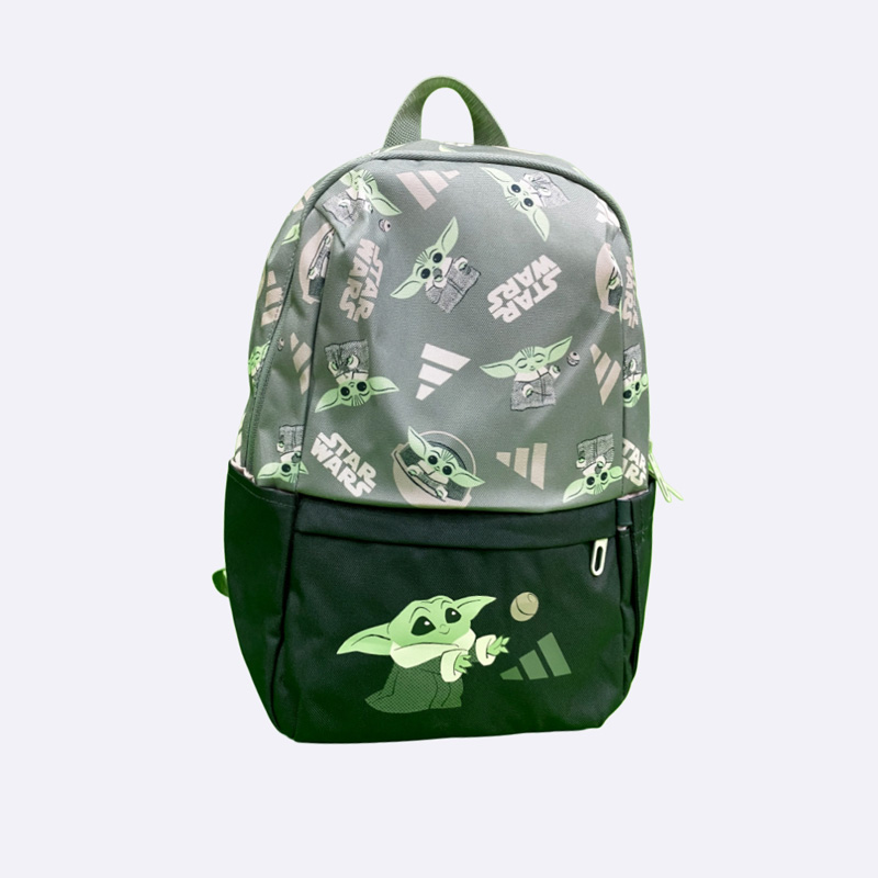 حقيبة ظهر رائعة بتصميم مستوحى من شخصية "الطفل" (بيبي يودا) من مسلسل حرب النجوم. تتميز بطبعة متكررة لشخصيات "الطفل" وشعار أديداس، مع جيب أمامي كبير يظهر فيه "الطفل" وهو يلعب بكرة. حقيبة مثالية لمحبي حرب النجوم، مناسبة للمدرسة أو للاستخدام اليومي