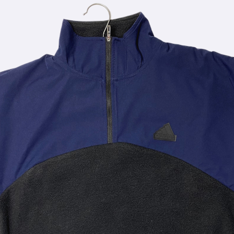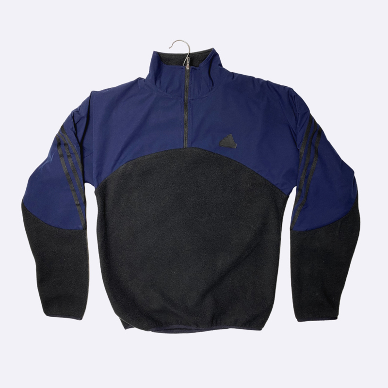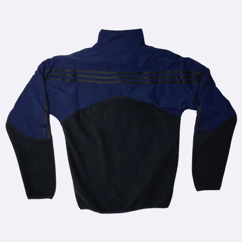 طقم شتوي من قطعتين مصنوع من البوليستر، يتكون من سويت شيرت بسحاب قصير وياقة واقفة وتصميم مقسوم عند الصدر، وبنطلون رياضي بخصر مطاطي، وكلاهما مزين بخطوط على الأكمام والأرجل.