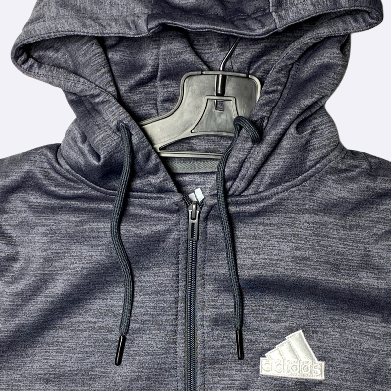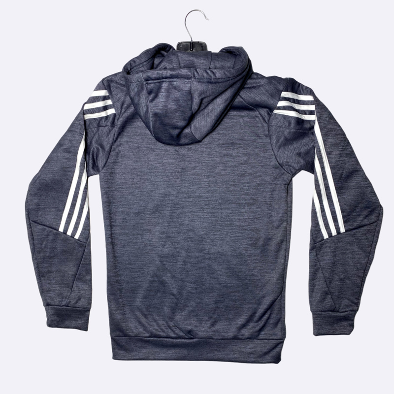 جاكيت رياضي مريح بأكمام طويلة مصنوع من قماش منقّط، يتميز بسحاب أمامي كامل وجيب أمامي مقسوم، مزود بغطاء رأس وخطوط مميزة على الأكمام.
