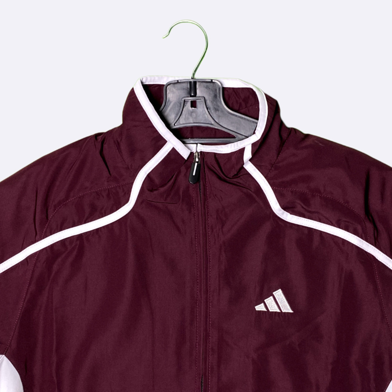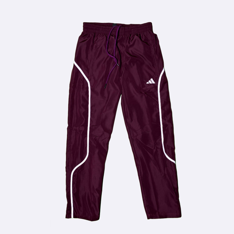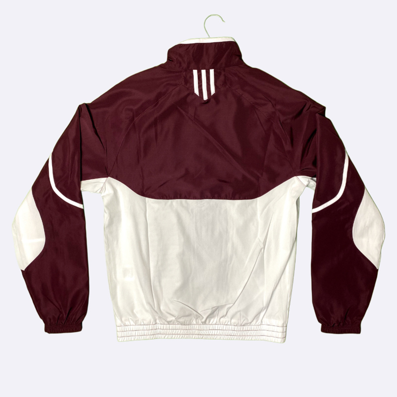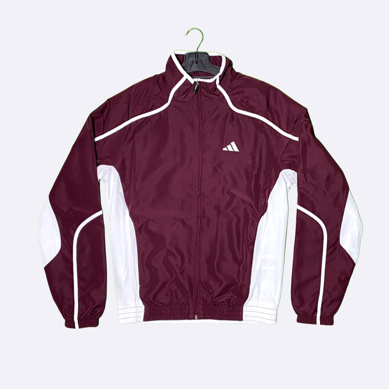 طقم رياضي خفيف من قطعتين، يتكون من جاكيت بسحاب كامل وياقة واقفة، وبنطلون بخصر مطاطي، وكلاهما يتميزان بتصميم مقسوم وأنابيب (piping) متباينة، مناسب للتدريب الخفيف