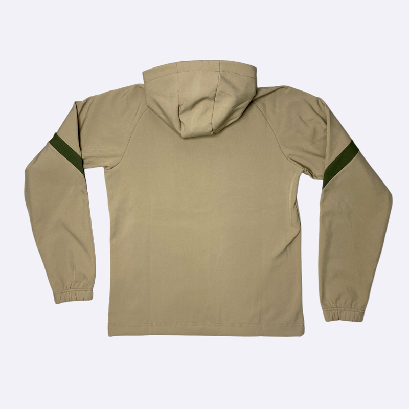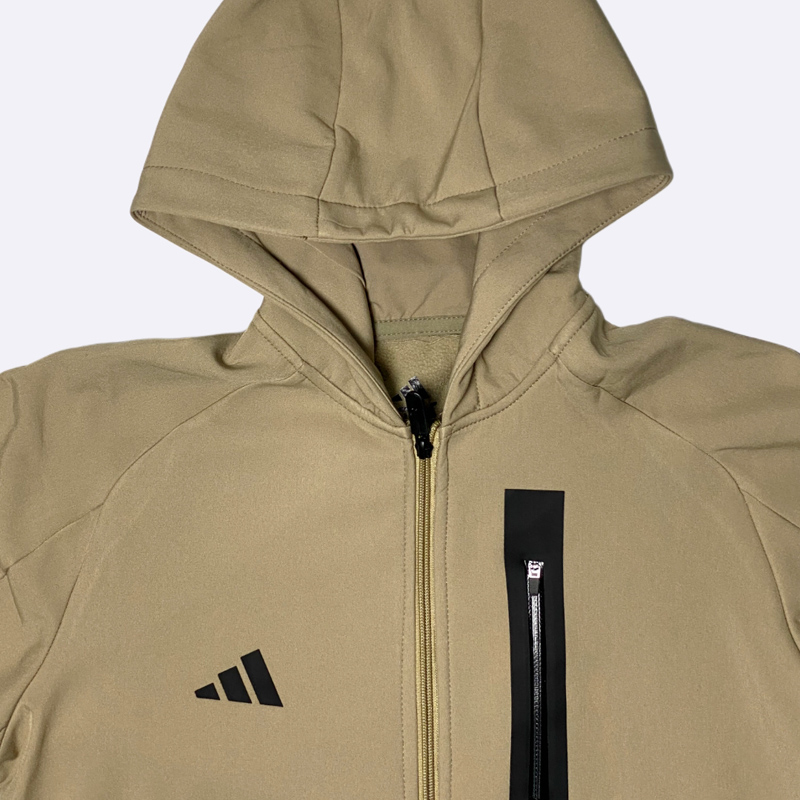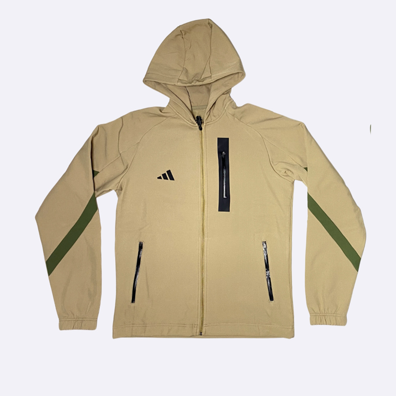 ة رياضية رجالية متكاملة من قطعتين، تتميز بجاكيت بسحاب كامل بغطاء رأس وجيوب بسحّابات، وبنطلون رياضي بخصر مطاطي وجيوب بسحّابات، مع شعار أديداس على كلتا القطعتين وتفاصيل على الأكمام والأرجل.