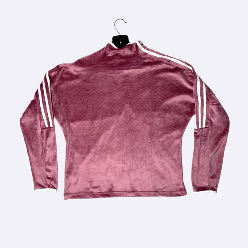 طقم بدلة رياضية نسائية بلمسة فاخرة، مصنوع من قماش المخمل الناعم (Velour). يتكون من سويت شيرت بسحاب ربعي (Quarter-Zip) وخطوط أديداس الثلاثة على الأكمام، وبنطلون رياضي واسع بخصر مطاطي والخطوط الثلاثة على الجوانب.