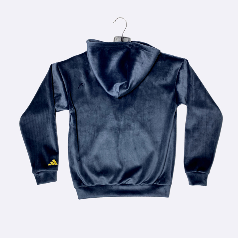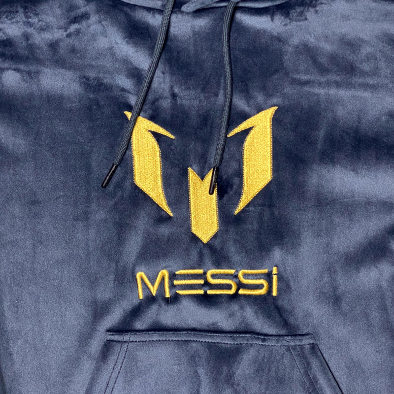 طقم رياضي رجالي قطيفة (?يلور) باللون الكحلي الداكن، يحمل شعار وأسم اللاعب ليونيل ميسي الذهبي، مثالي للتدريب أو اللبس الكاجوال المريح.