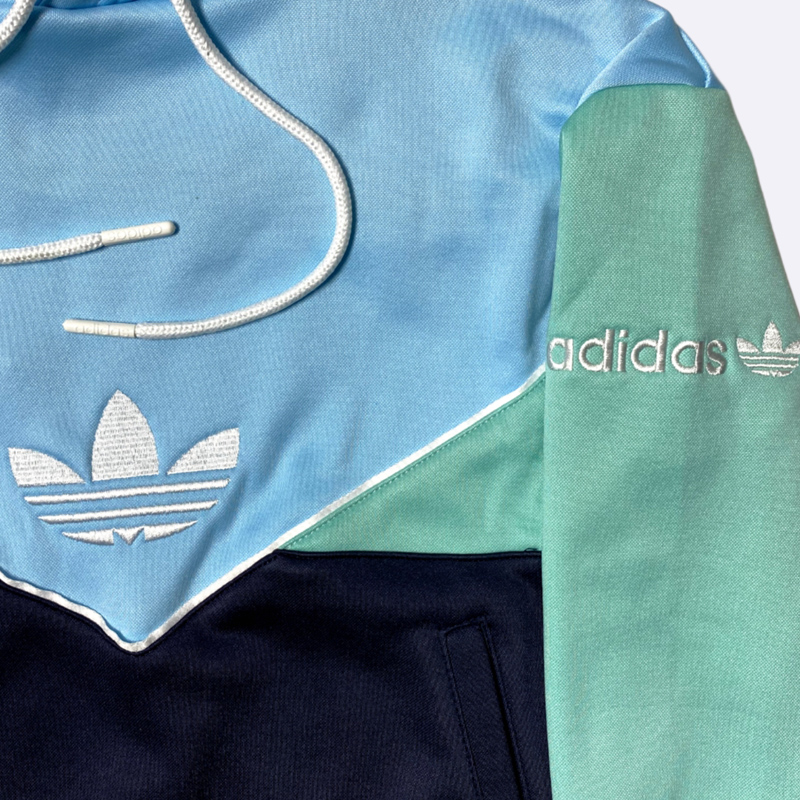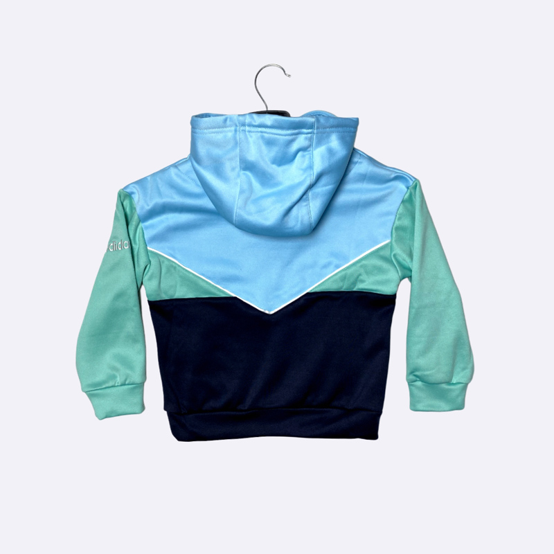 طقم رياضي للأولاد بتصميم كتل الألوان (Color Block) مميز بدرجات الأزرق والأخضر، يتميز بجاكيت بغطاء رأس (هودي) وشعار تريفويل (شعار أوريجينالز).