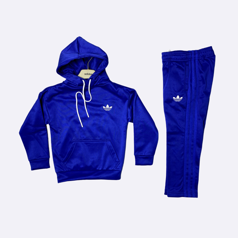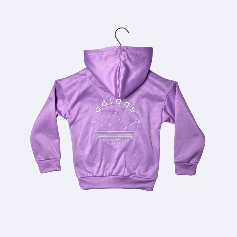 طقم رياضي للبنات باللون البنفسجي الفاتح، يتميز بخامة لامعة (ساتان) وبنطلون بثلاثة خطوط جانبية بيضاء، يحمل شعار تريفويل (شعار أوريجينالز).