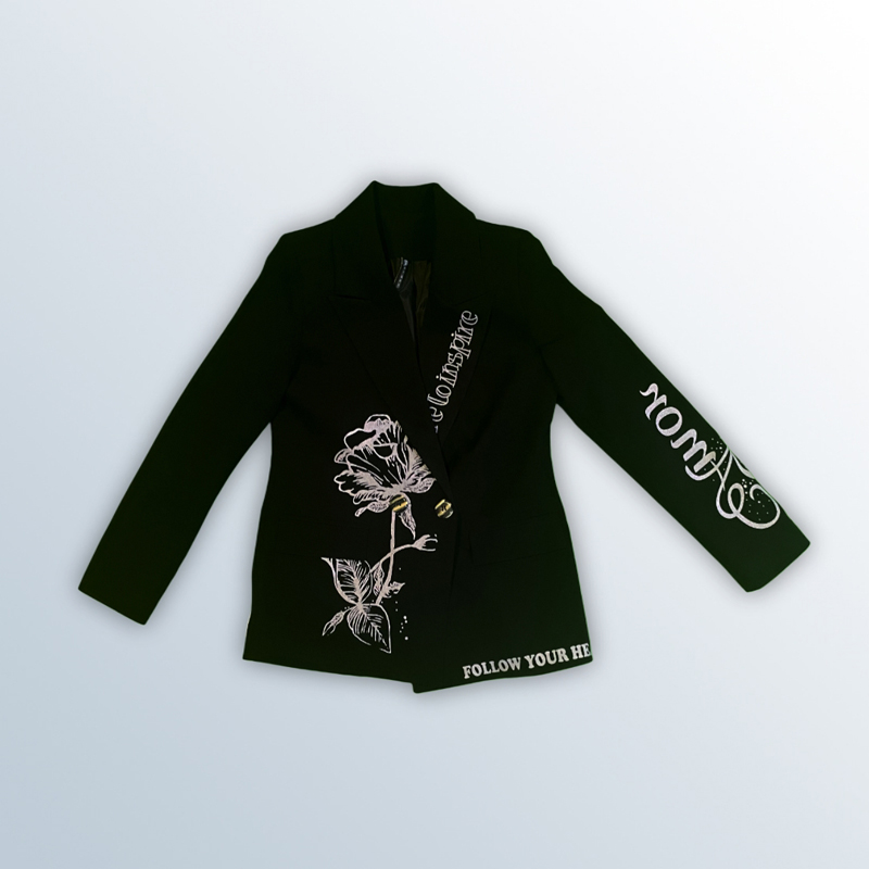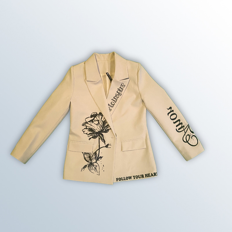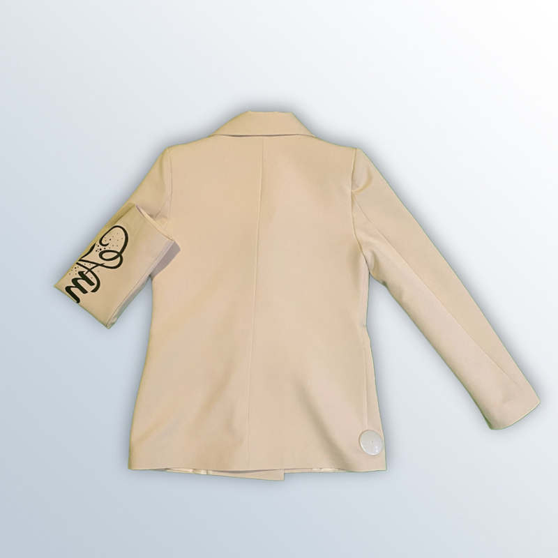 جاكيت بليزر بتصميم مميز مصنوع من مزيج من 65% بوليستر. يتميز بنقوش وطبعات عصرية على الجهة الأمامية وعلى الأكمام تضفي عليه لمسة فريدة وجريئة. متوفر بألوان: أسود، بيج. مثالي لإطلالة عصرية وغير تقليدية.
