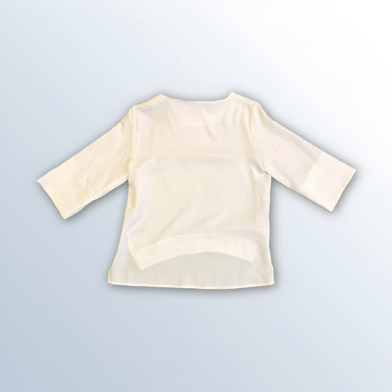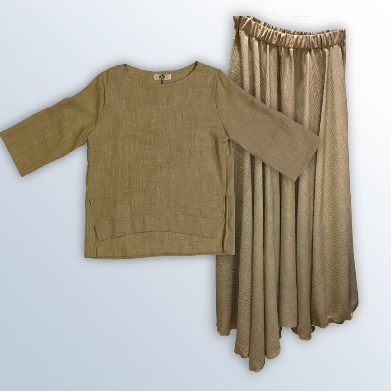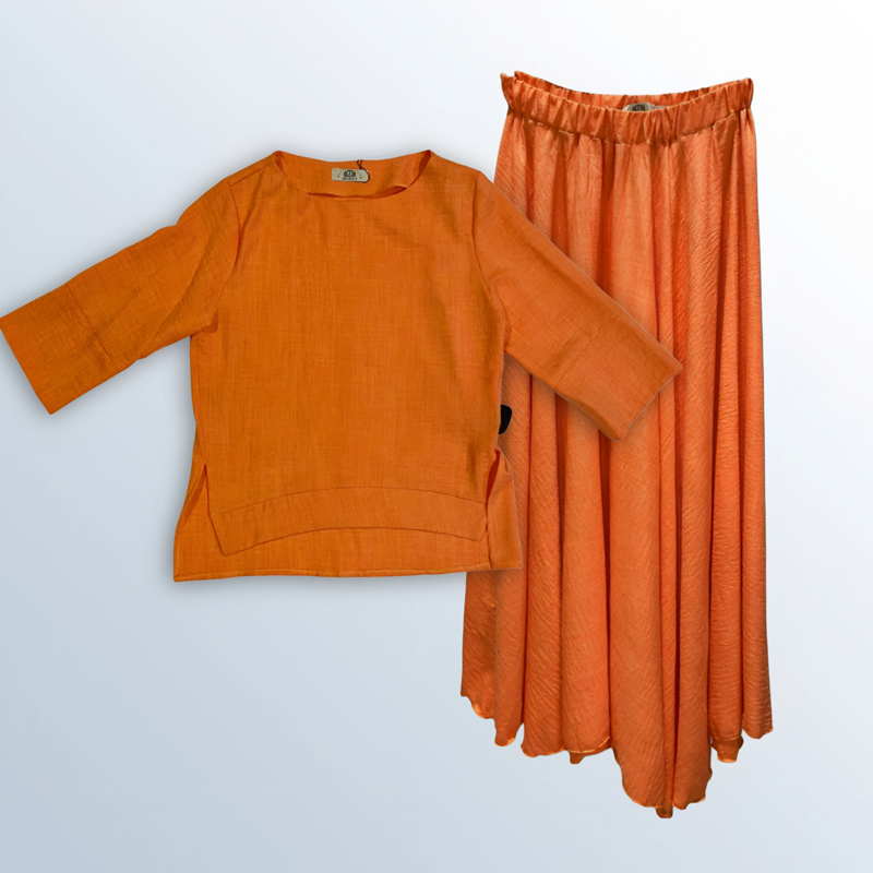 طقم نسائي مكون من قطعتين: بلوزة وتنورة من قماش اللنن بنسبة 65% قطن. متوفر بألوان الأورانج، البيج والأبيض.
