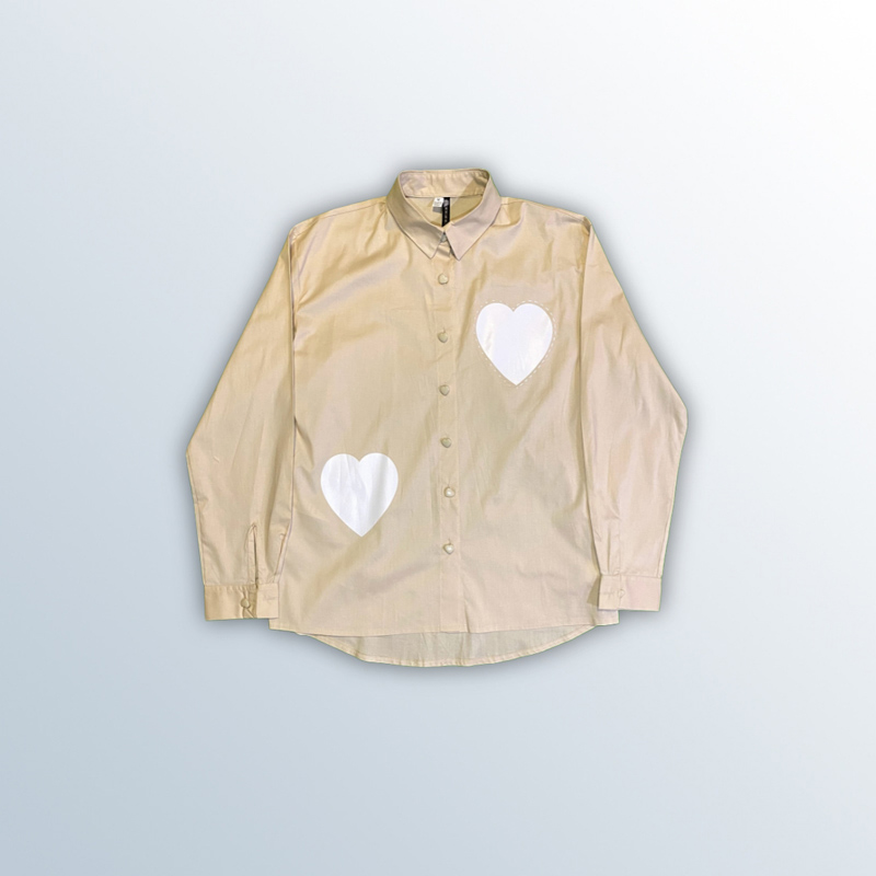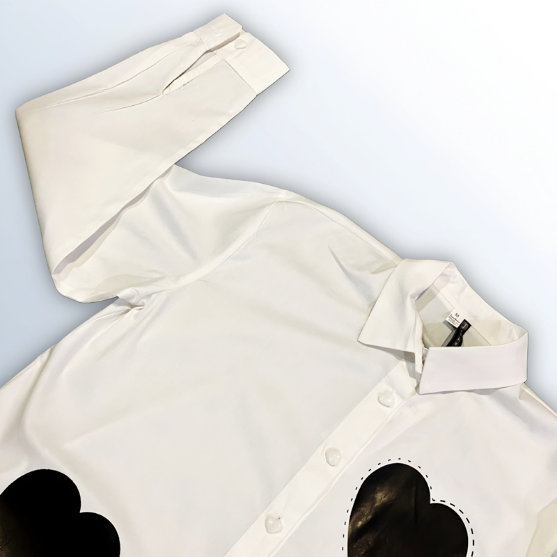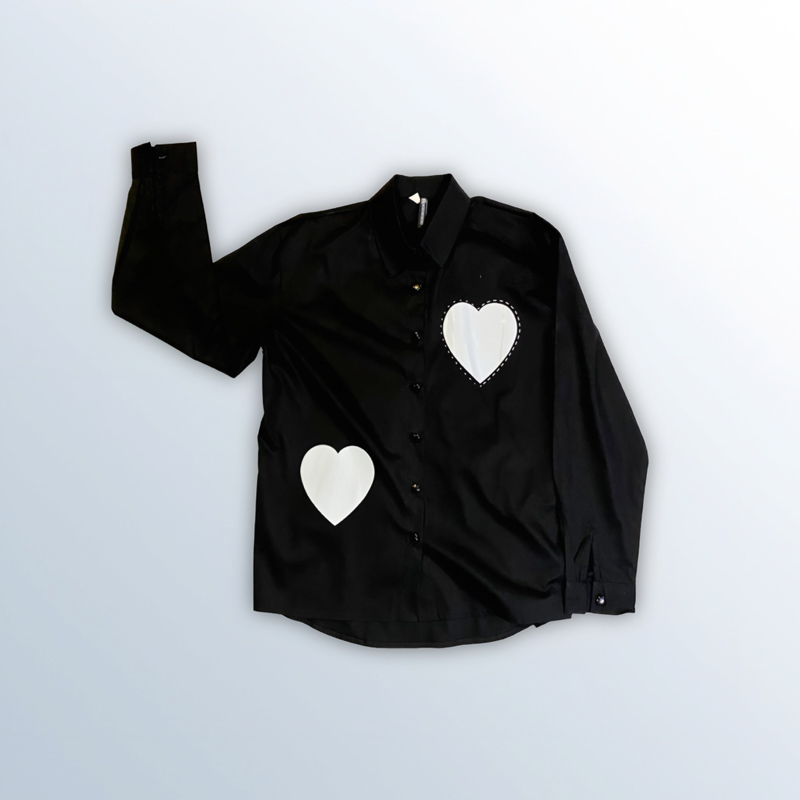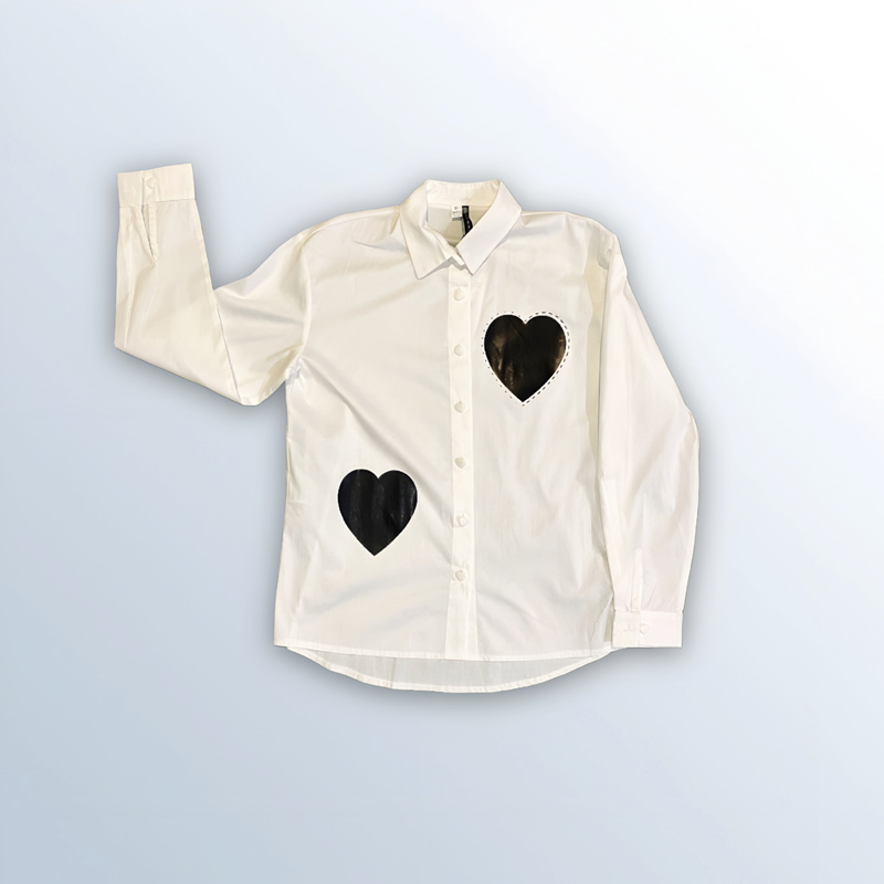قميص نسائي بأكمام طويلة، مصنوع من القطن بنسبة 65%، ومزين بقلوب من الجلد الأسود. متوفر باللون الأبيض، البيج والأسود.