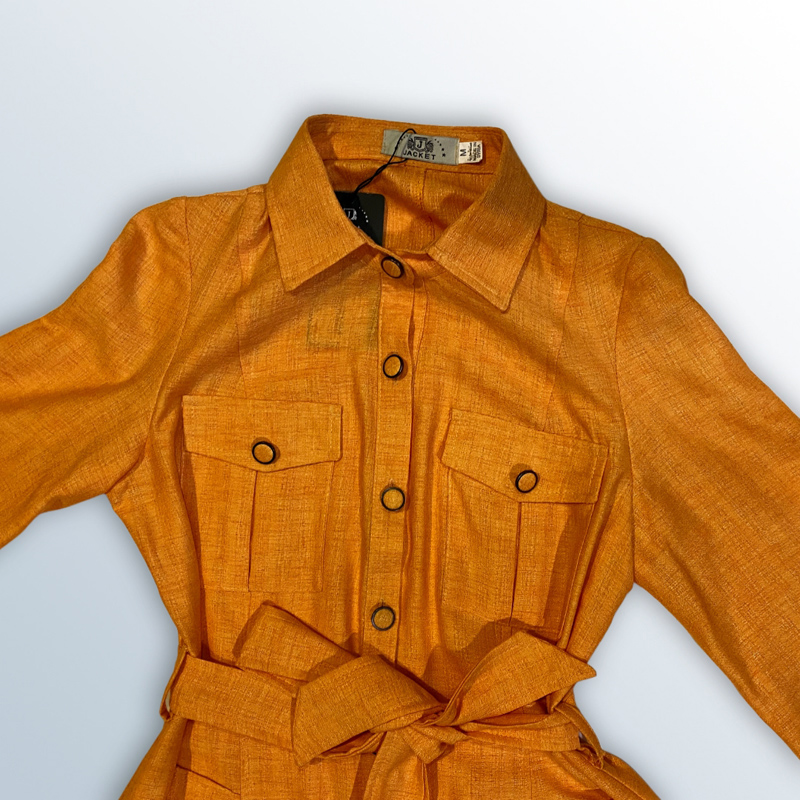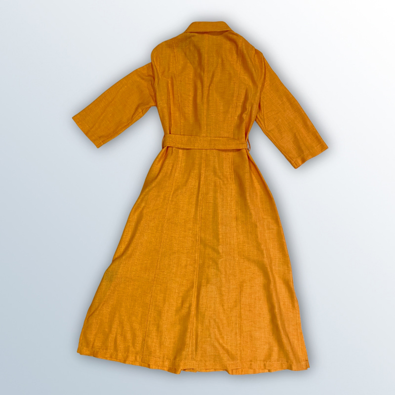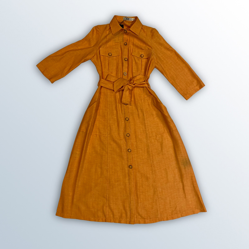 فستان نسائي طويل على شكل قميص، بأكمام ثلاثة أرباع، وحزام عند الخصر. مصنوع من القطن بنسبة 65%، ومتوفر بألوان: الموتارد، الأورانج الغامق، والأورانج الفاتح.