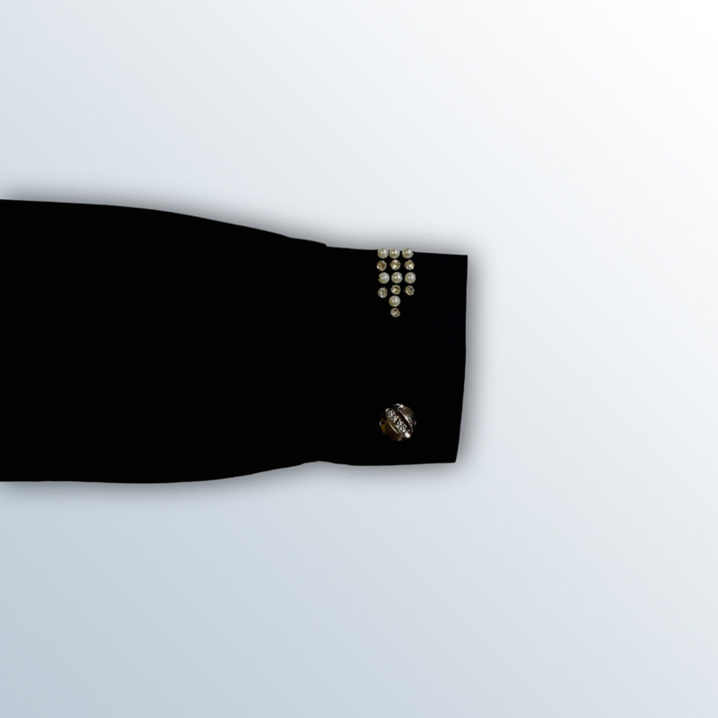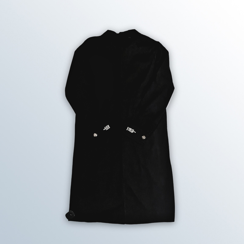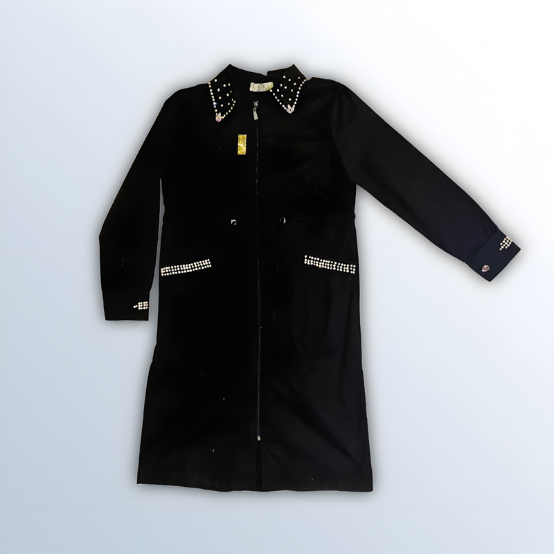 معطف نسائي طويل باللون الأسود، مزين بالكريستال على الياقة، الجيوب، والأكمام. يحتوي على سحاب للإغلاق. مصنوع من القطن بنسبة 98%، ومتوفر باللونين الأسود والأبيض.