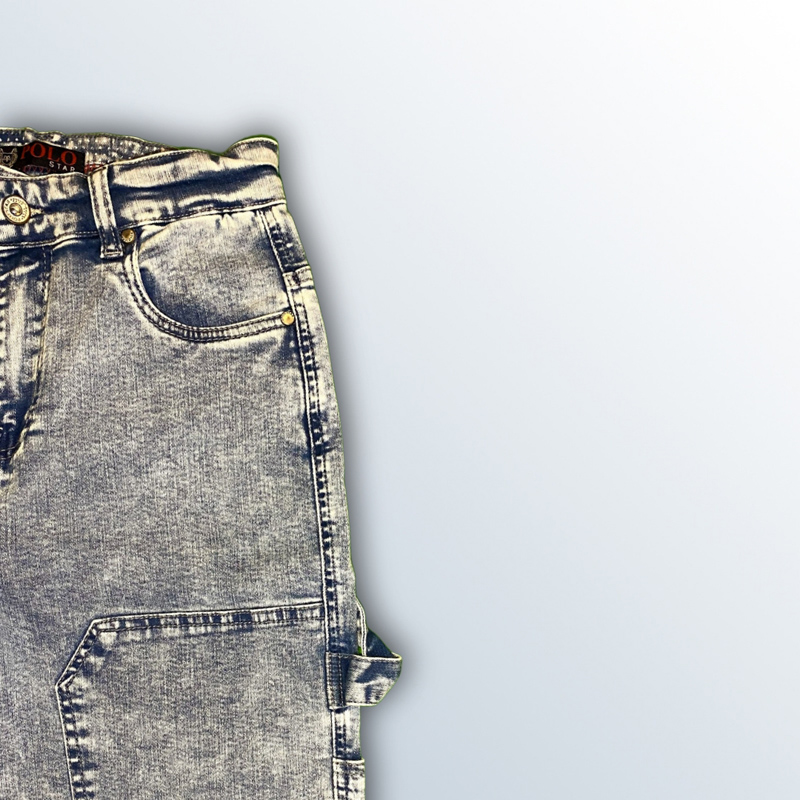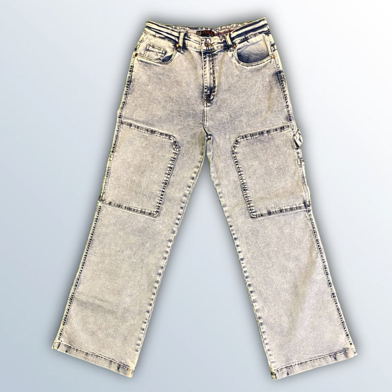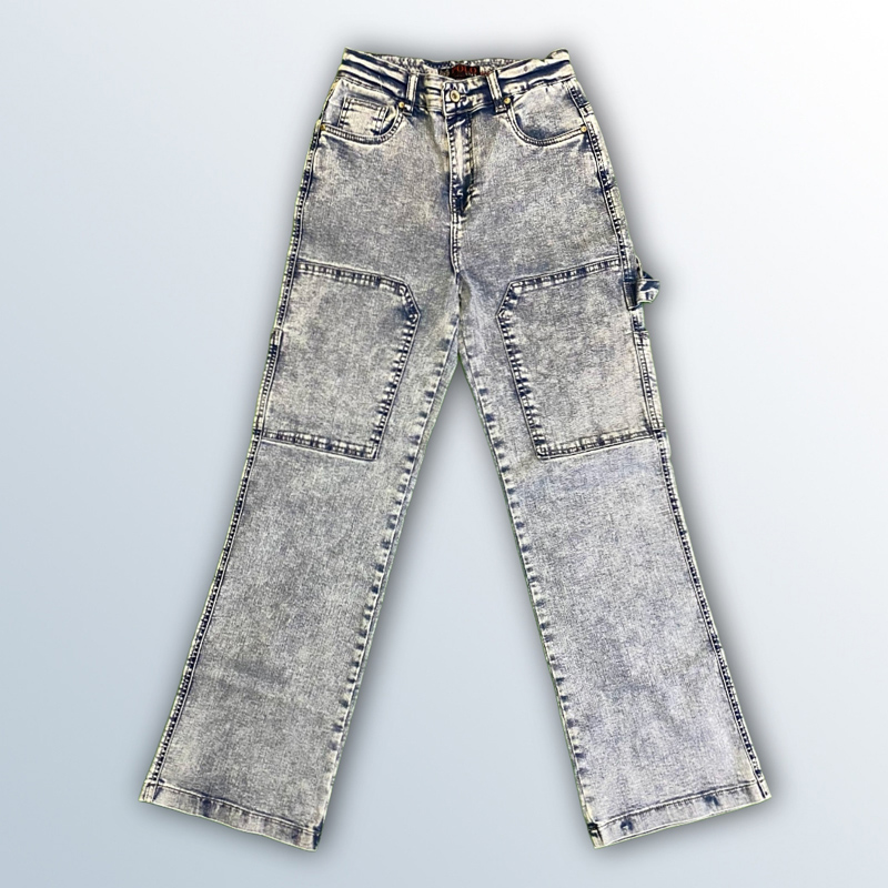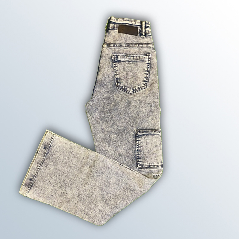 بنطلون جينز نسائي بقصة "بوت كات" (Boot-cut)، مزود بجيوب جانبية "كارغو"، مصنوع من القطن بنسبة 98%.