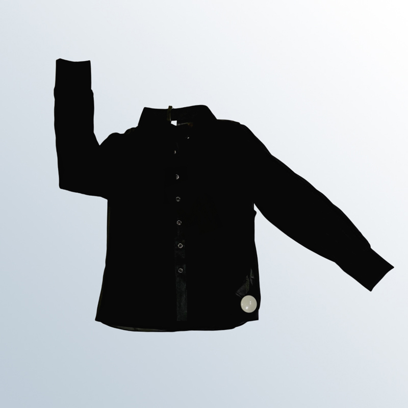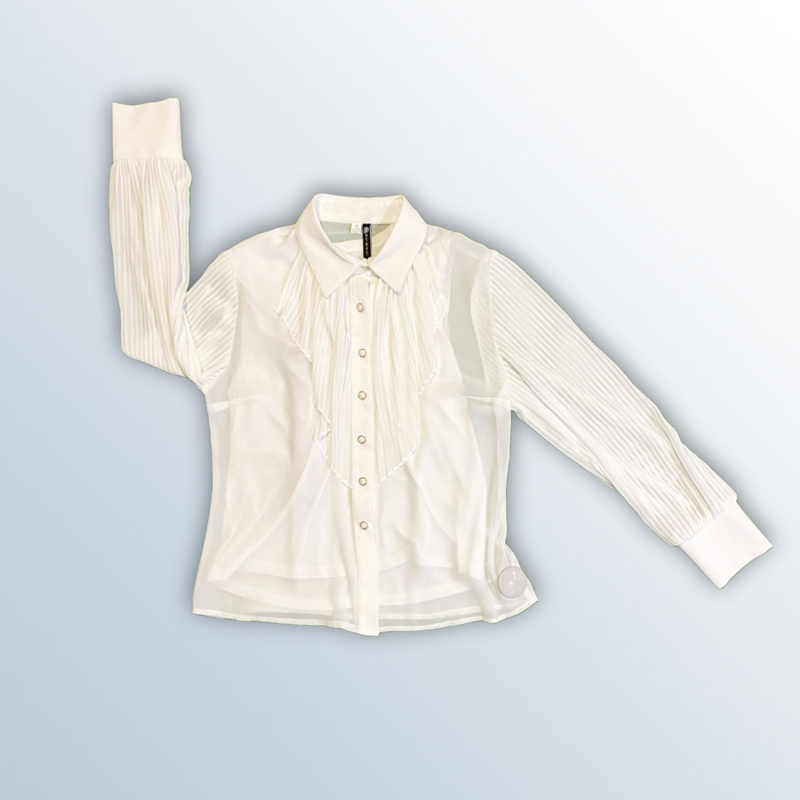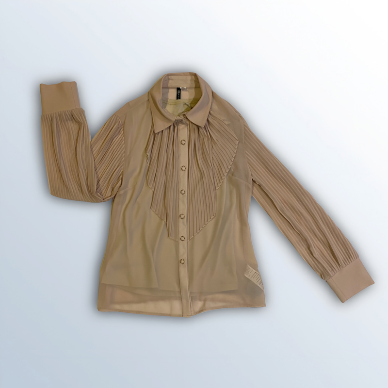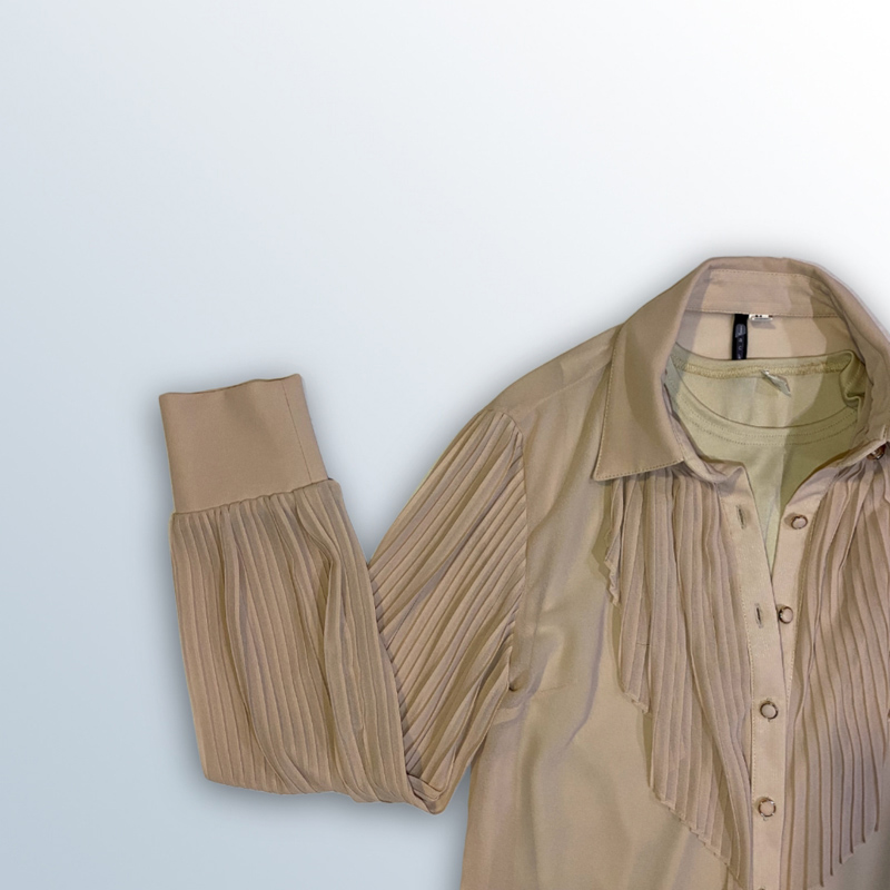 قميص نسائي بأكمام طويلة مصنوع من قماش الشيفون البوليستر بنسبة 100%. يأتي مع بروتيلة داخلية، ومزين بتفاصيل كشكشة عمودية على الصدر والأكمام. متوفر بألوان: البيج، الأبيض، الأسود، والزهري.