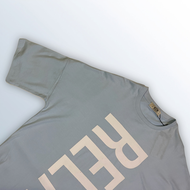 ميص نسائي طويل وفضفاض بطبعة "RELAX" عمودية، مصنوع من القطن بنسبة 98%. متوفر بألوان: الأبيض، الأسود، السماوي، والبيج.