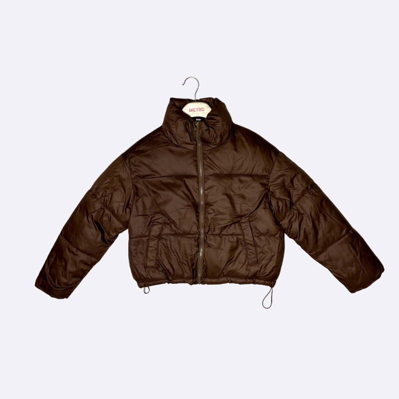 جاكيت نسائي قصير منفوخ ومبطن، يتميز بتصميم عصري وياقة مرتفعة.