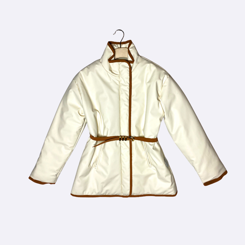 جاكيت نسائي أنيق ومبطّن باللون الزيتوني الفاتح، يتميز بياقة عالية وحواف وحزام من الجلد الصناعي بلون بني متباين.