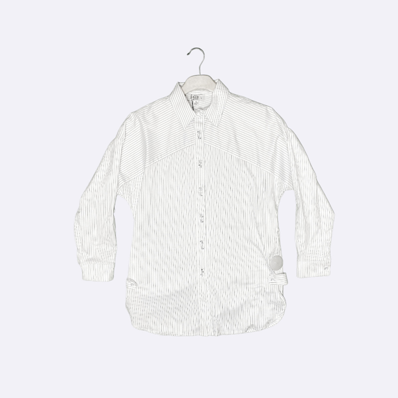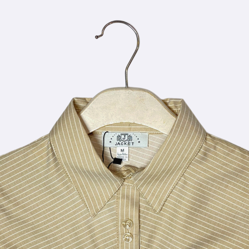 قميص نسائي بأكمام ثلاثة أرباع، يتميز بنقوش مقلمة عمودية بيج/بني فاتح وقصّة على الكتفين بتفاصيل مستوحاة من الطراز الغربي.