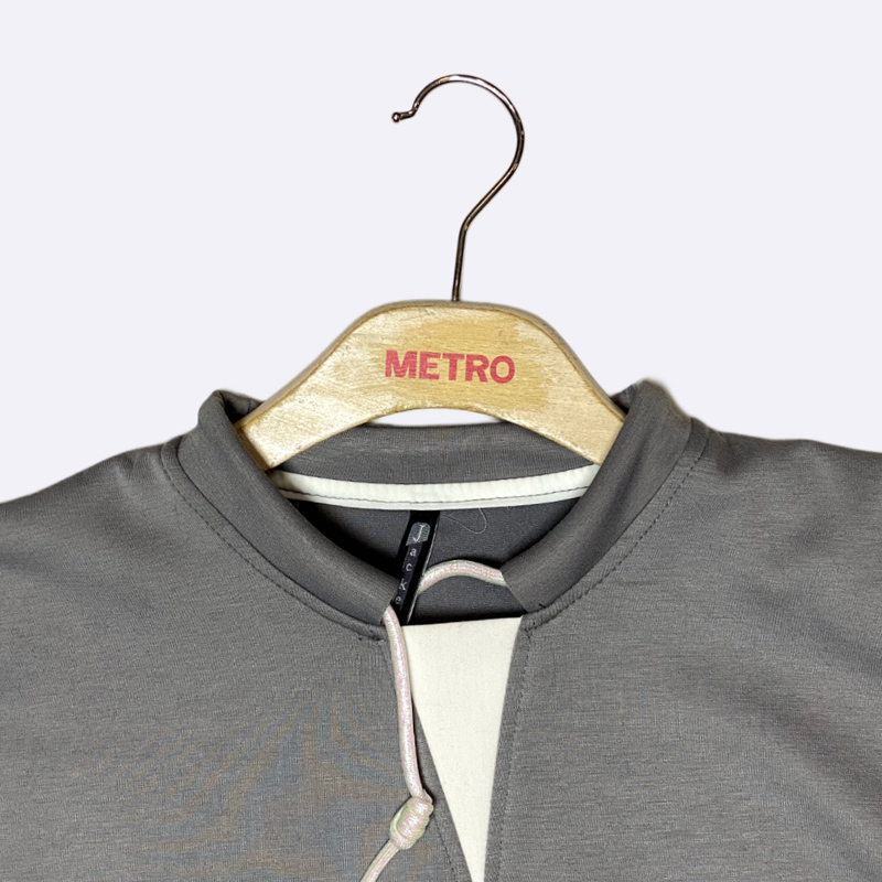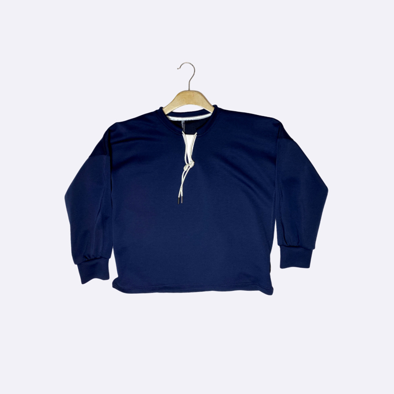 سويت شيرت/كنزة نسائية مريحة بلون رمادي داكن، يتميز بياقة مفتوحة على شكل V مزودة بأربطة بيضاء، مع قصّة كتف عريضة (Dropped Shoulder) مثالي لإطلالة كاجوال.