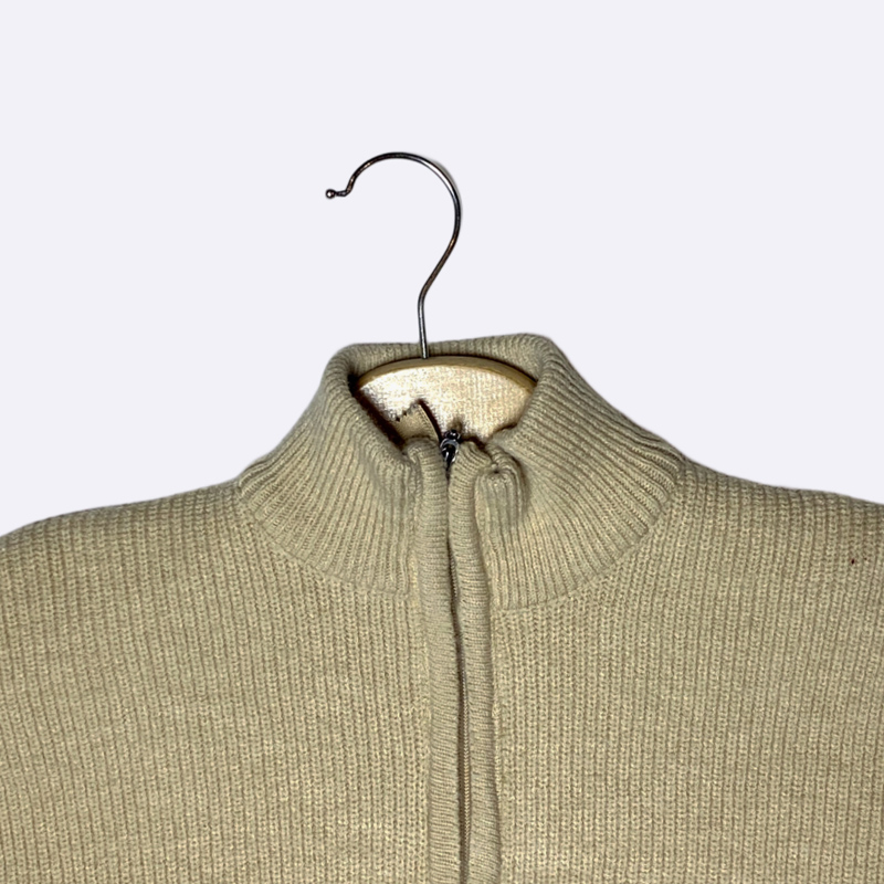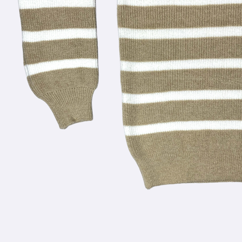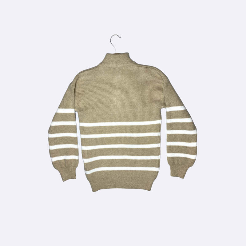كنزة صوفية نسائية مريحة بلون بيج/جملي مع خطوط أفقية عريضة باللون الأبيض على الصدر والأكمام، تتميز بياقة عالية وسحاب نصفي.