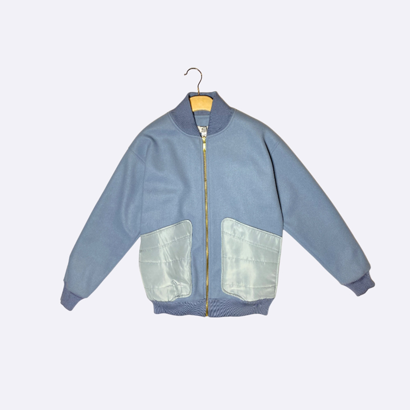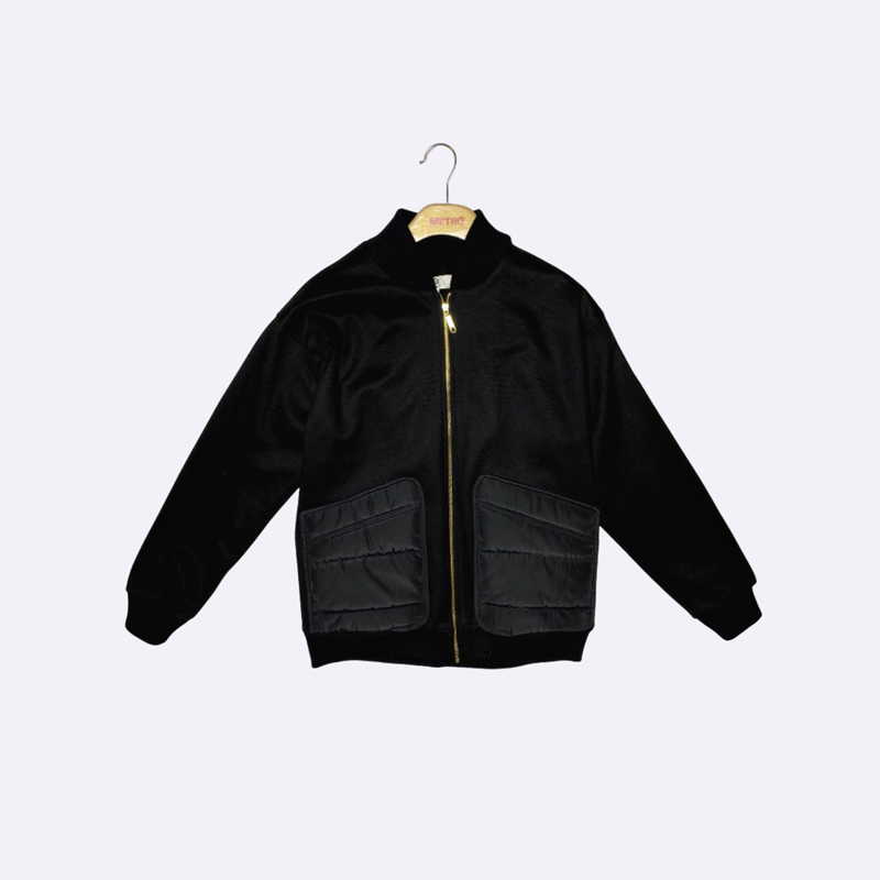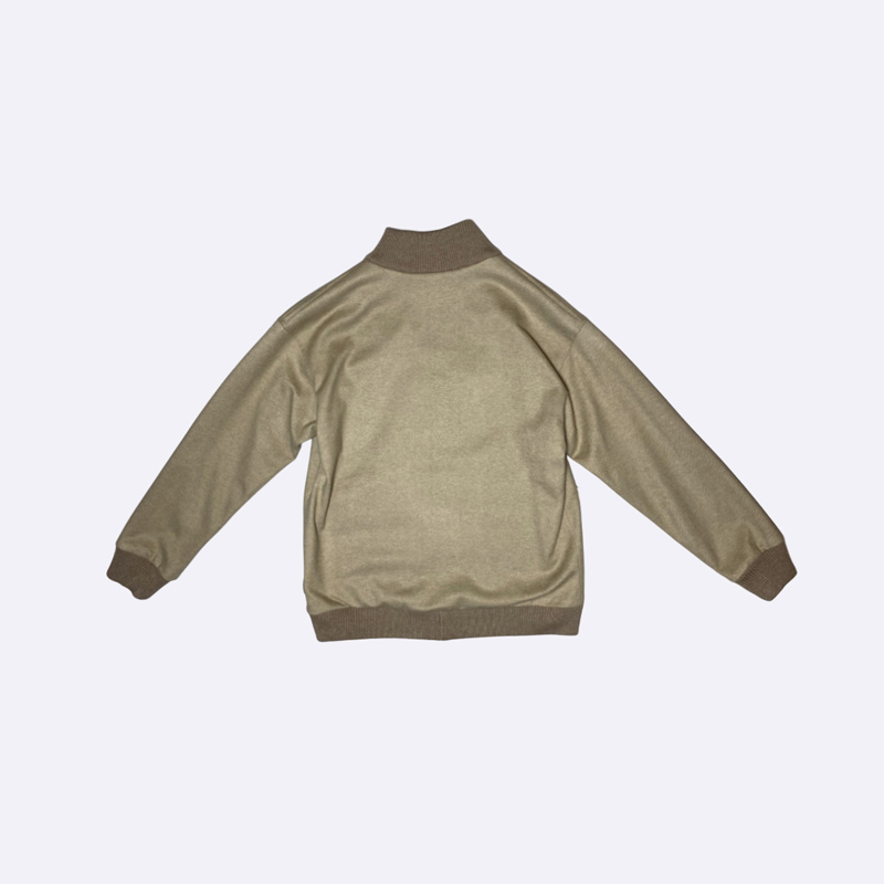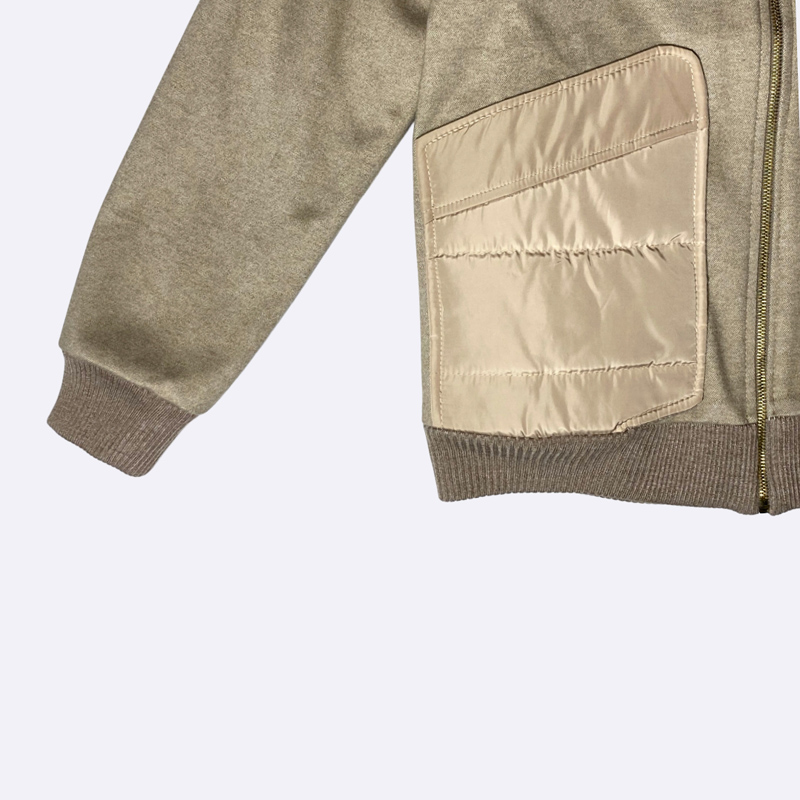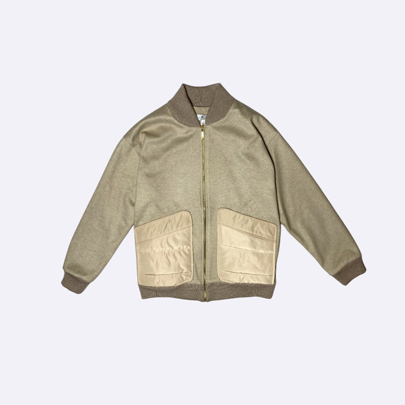 جاكيت بومبر نسائي عصري بلون بيج/جملي، بسحاب أمامي وياقة وأطراف مضلعة (Ribbed)، ويتميز بجيوب أمامية كبيرة مبطنة بلون فاتح متباين.