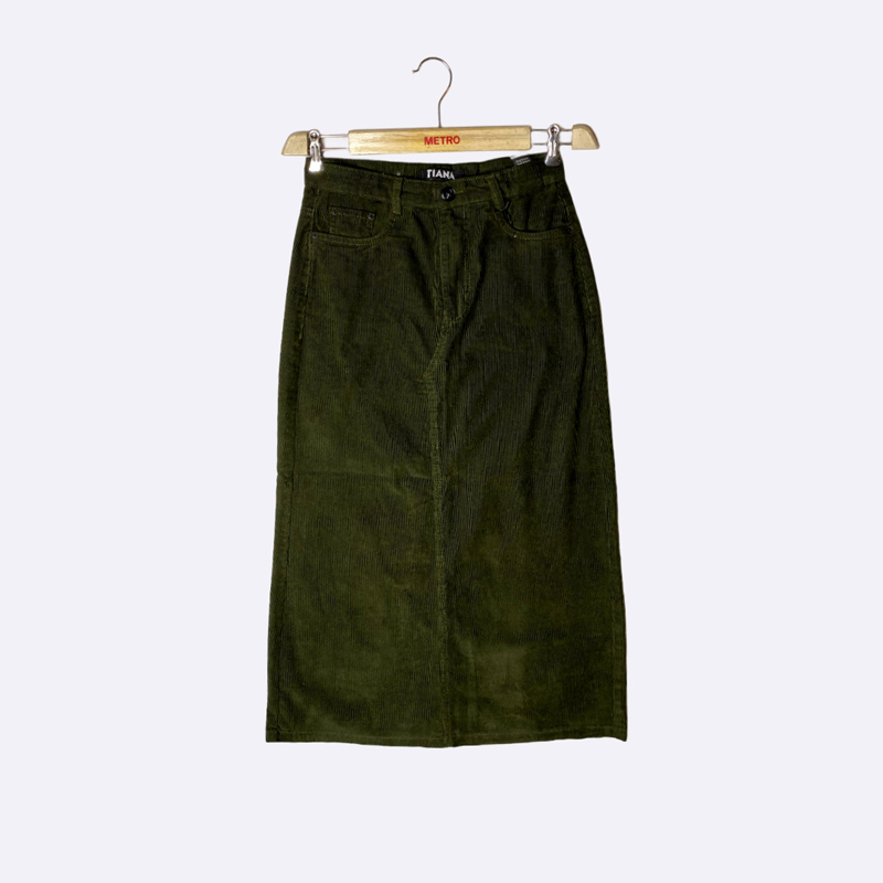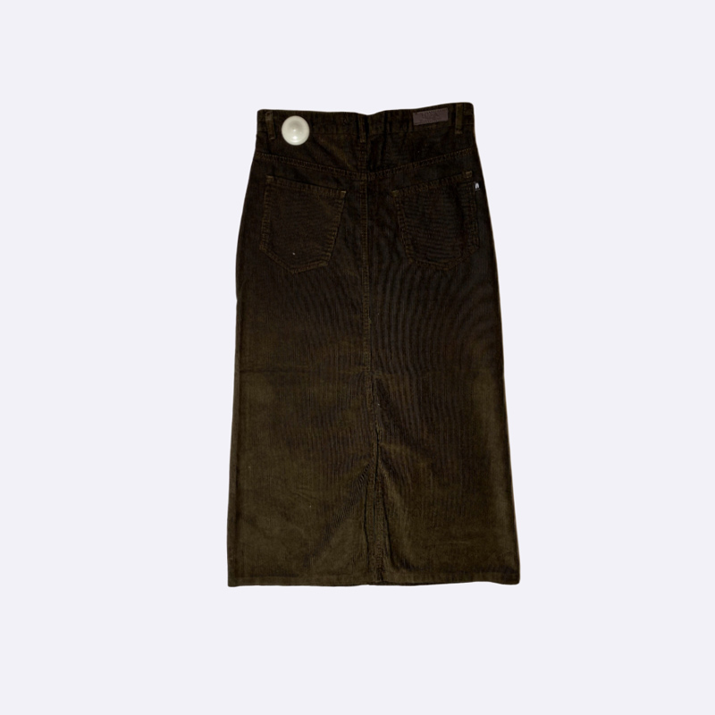 تنورة نسائية كلاسيكية بخصر عالٍ وطول ميدي/ماكسي، مصنوعة من قماش الكوردروي (المخمل المضلع) بلون بني داكن أو زيتوني، مع قصّة مستقيمة أنيقة.