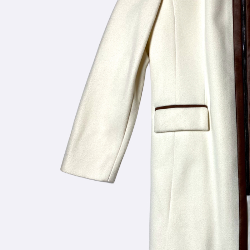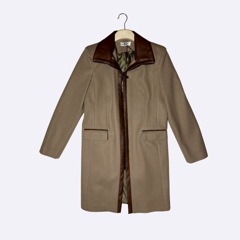 معطف نسائي بتصميم كلاسيكي ومزين بتفاصيل تباين جلدية عند الياقة والسحاب والجيوب.
