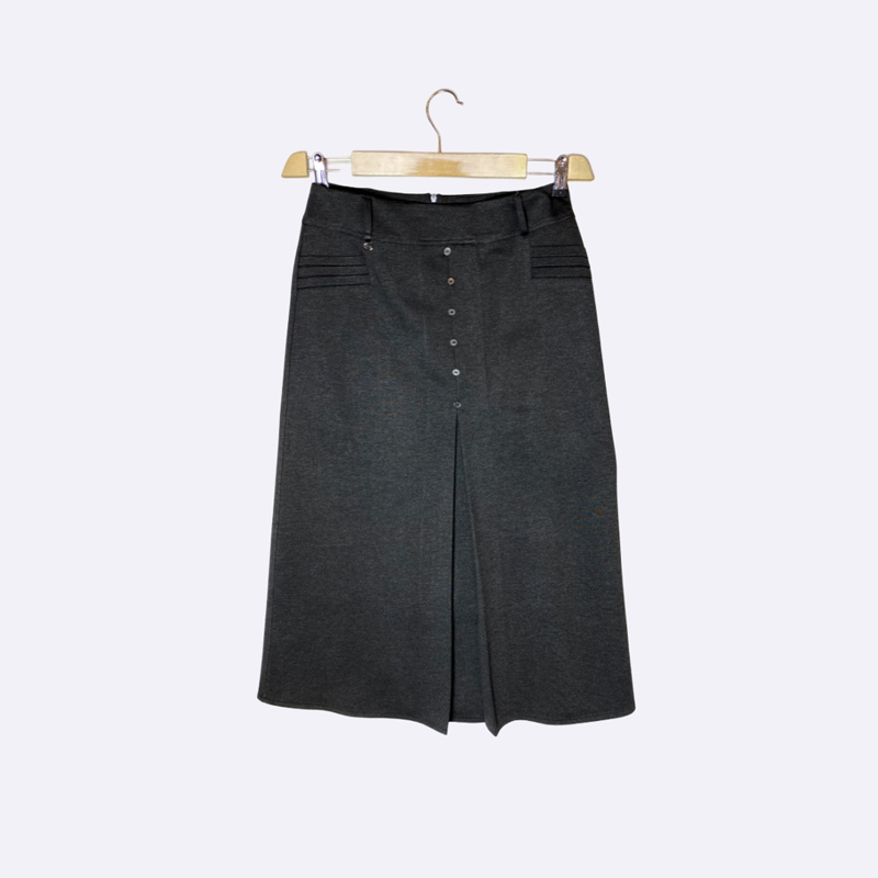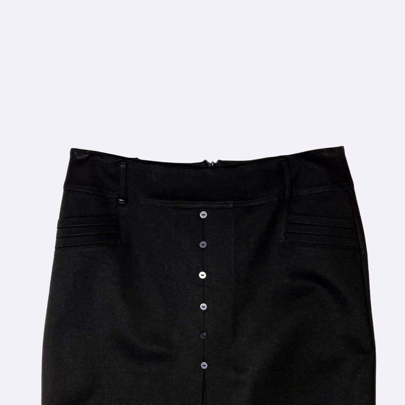 تنورة نسائية ميدي ضيقة (Pencil Skirt) تتميز بصف من الأزرار الأمامية المركزية وشق أمامي، مثالية للمظهر الأنيق والرسمي.