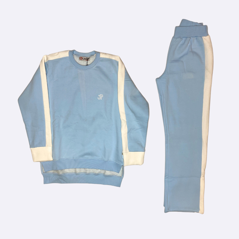 طقم رياضي نسائي مكون من سويت شيرت بياقة مستديرة وأكمام مخططة وسروال رياضي مريح بخصر مطاطي وخط جانبي متباين.