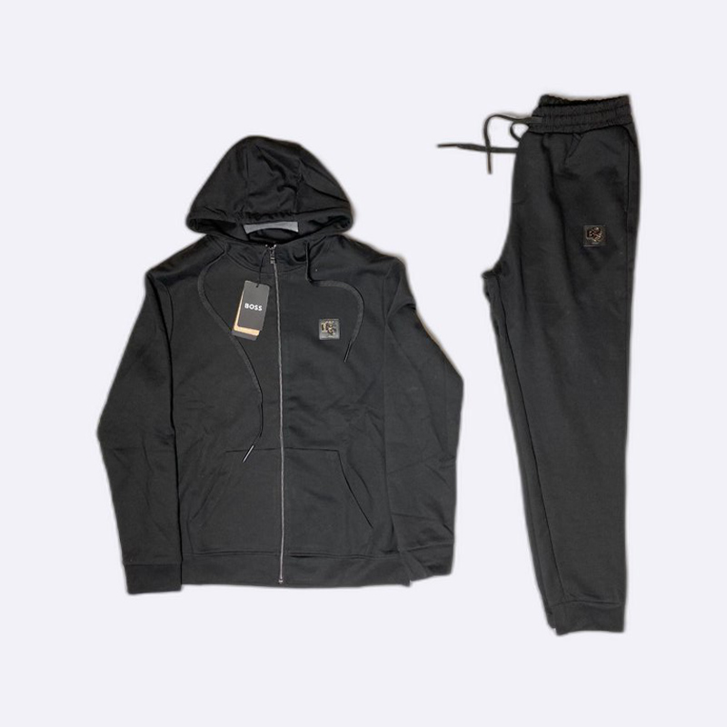 طقم أسود فاخر بسحاب كامل، يتميز بشعار BOSS المربع باللونين الأسود والذهبي على الصدر والبنطال.