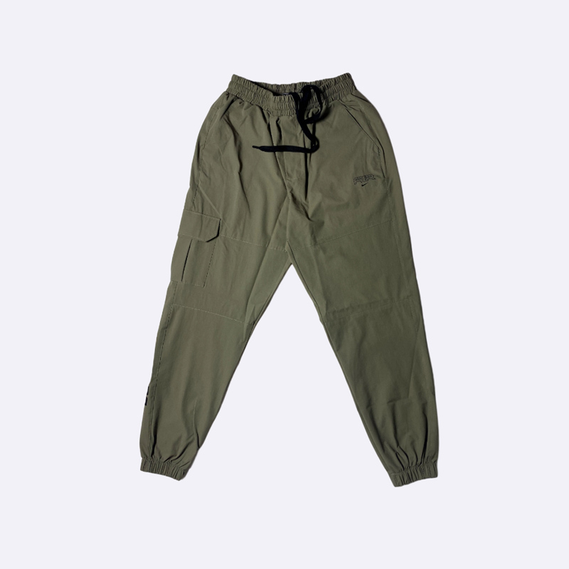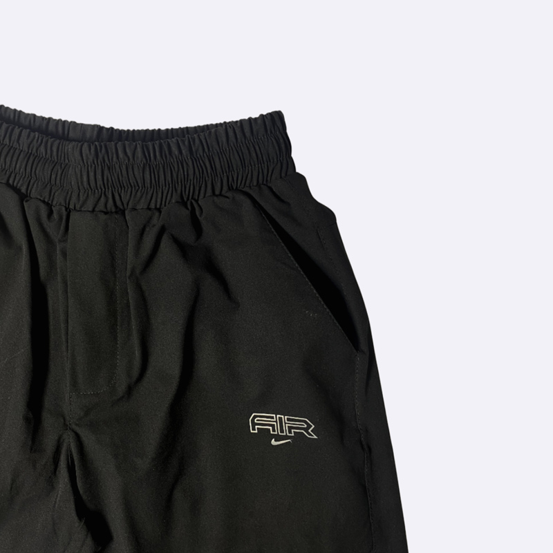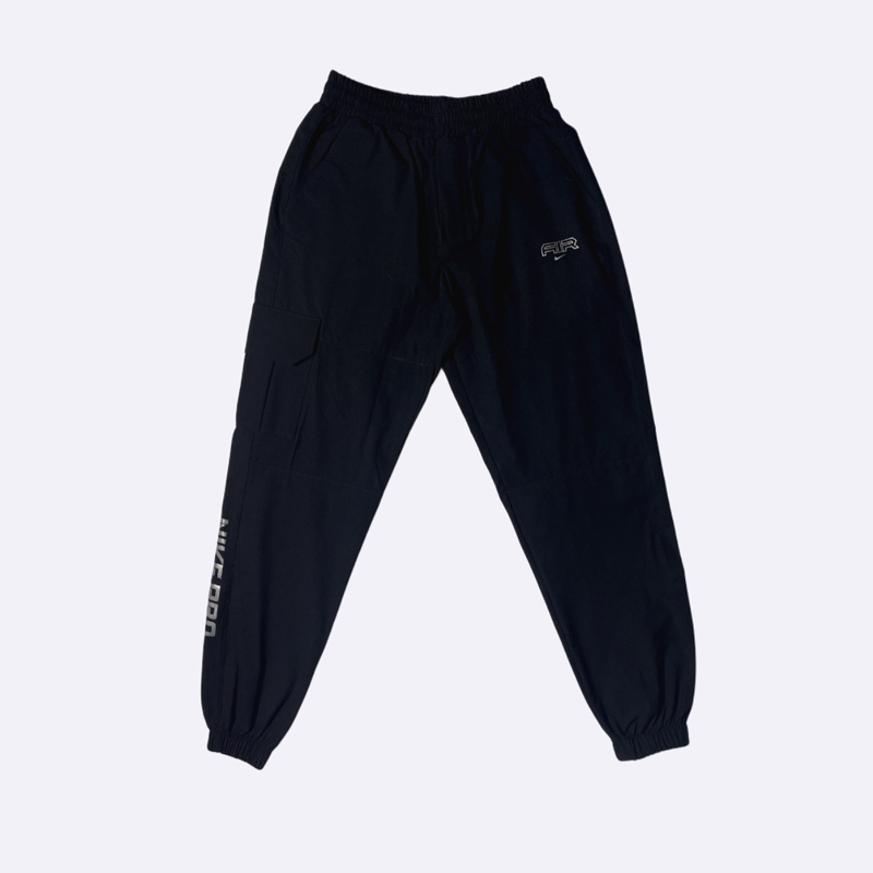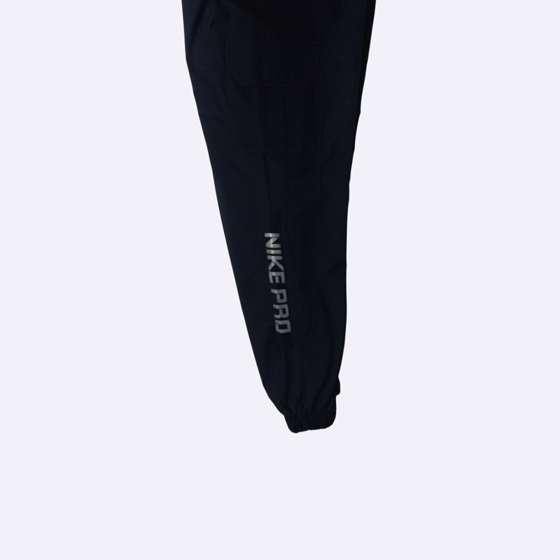 بنطال رياضي عصري باللون الأسود من نايكي، يتميز بتصميم "كارغو" مع جيب جانبي. مصنوع من قماش الباراشوت خفيف الوزن ومزين بشعاري "Nike Pro" و "Air" البارزين، مما يجعله خياراً مثالياً للأنشطة الرياضية أو الإطلالات اليومية.