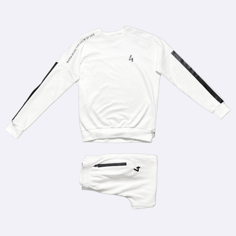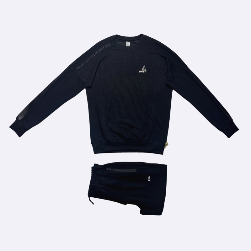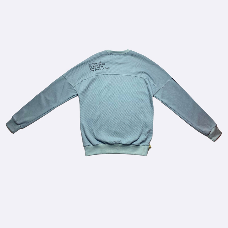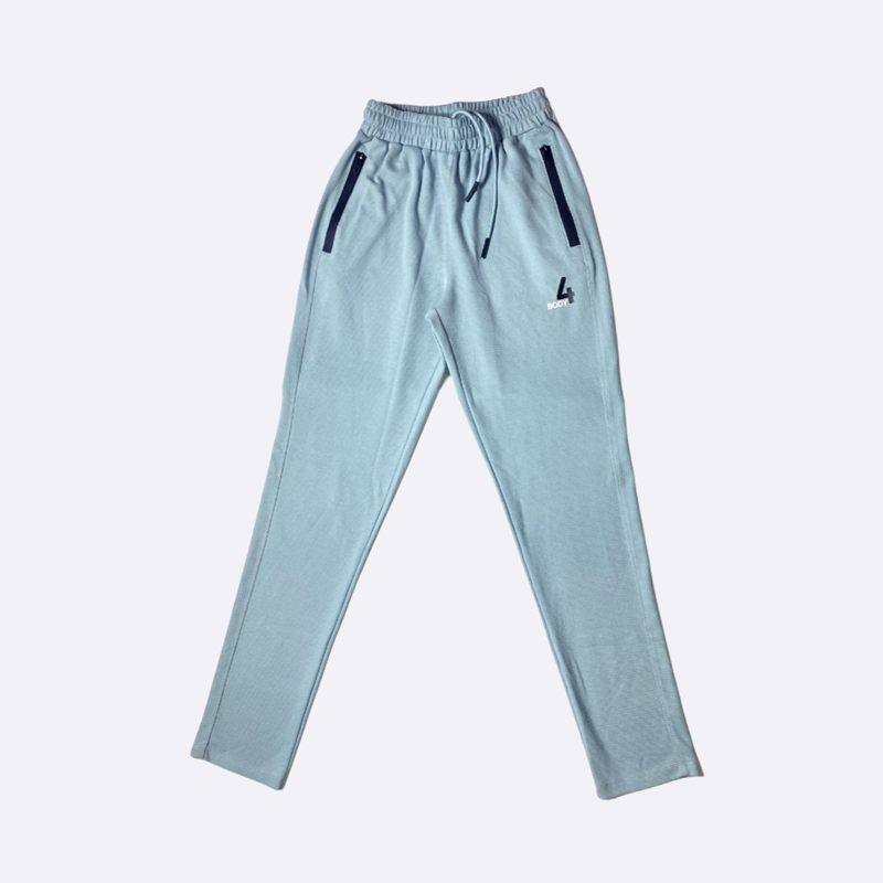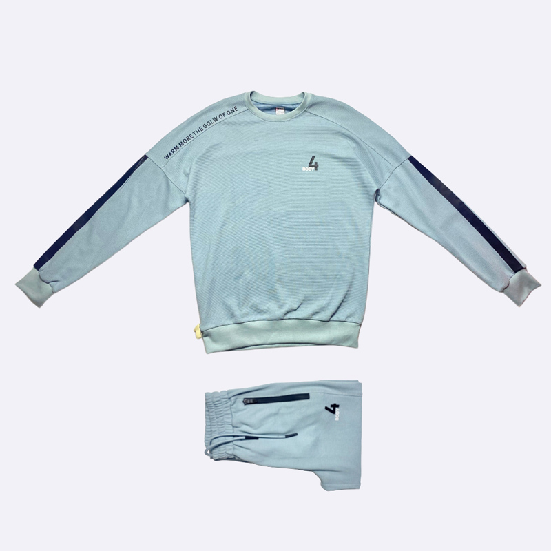 طقم رياضي مريح بلون أزرق فاتح، يتكون من سويت شيرت بقصّة دائرية وبنطال رياضي. يتميز السويت شيرت بخطوط داكنة على الأكمام، والبنطال مزود بجيوب بسحّاب. الطقم مصنوع من قماشة بوليفار التي توفر الراحة والمرونة للارتداء اليومي أو الأنشطة الرياضية.