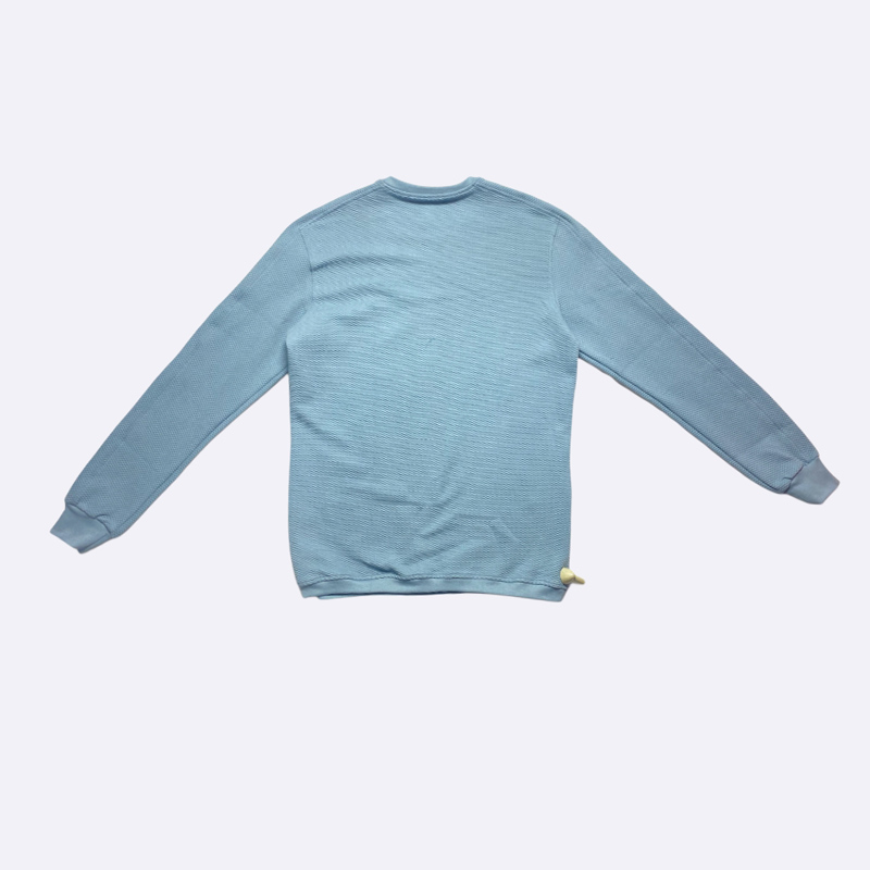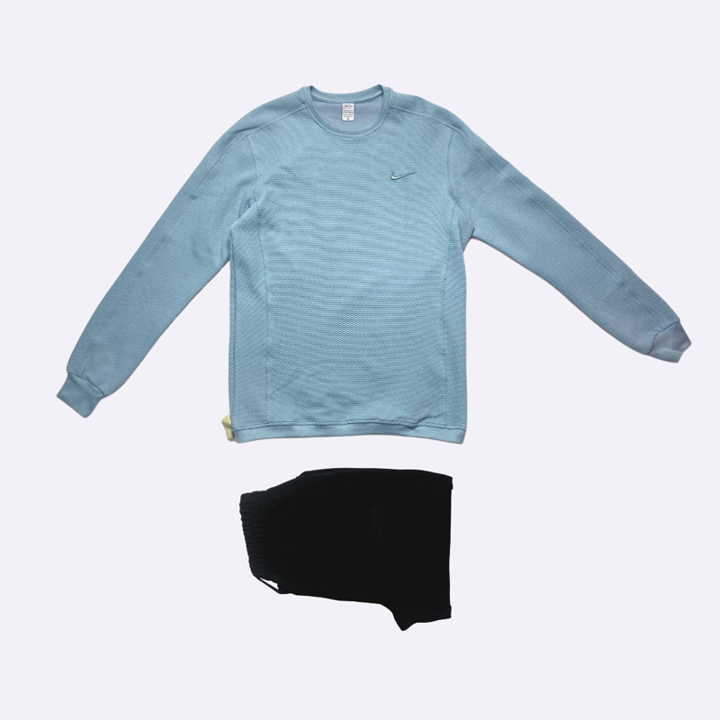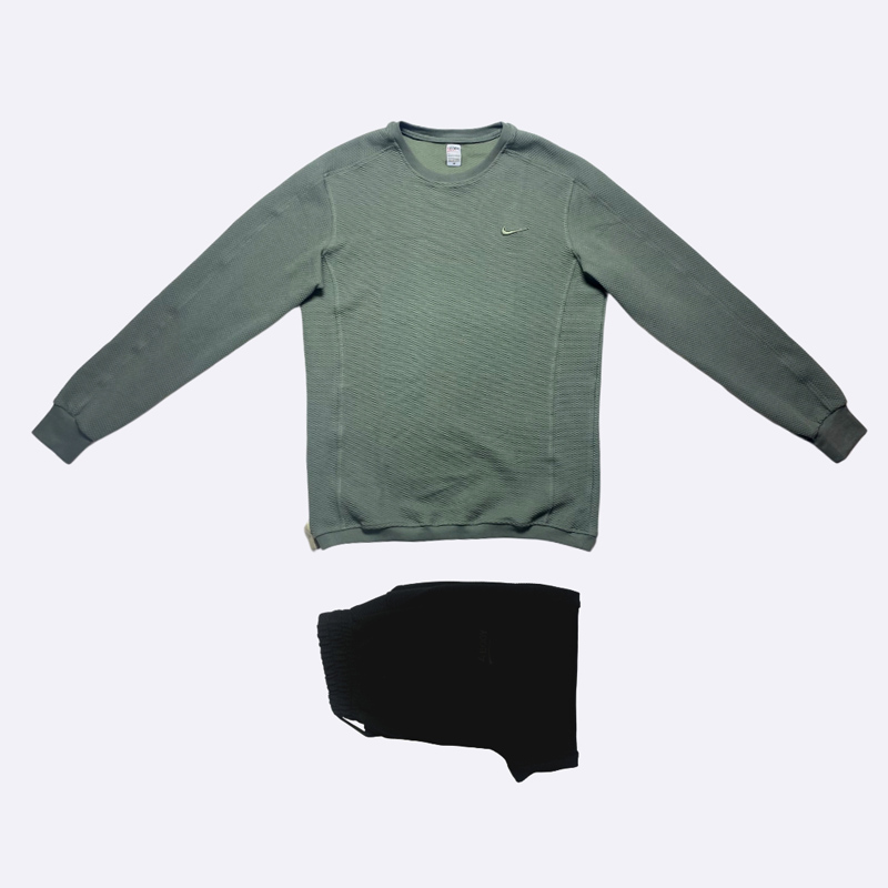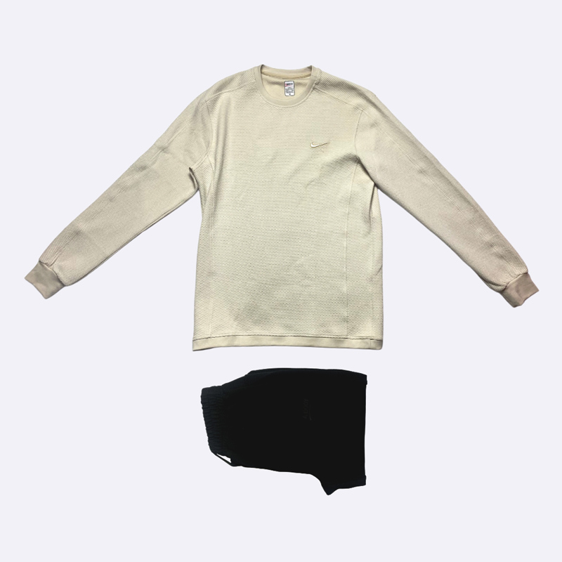 طقم رياضي مريح يتكون من سويت شيرت بأكمام طويلة وشورت، مصنوع من قماش القطن من ماركة بافي. يتميز السويت شيرت بتصميم منسوج وشعار صغير، مما يجعل الطقم مناسباً للارتداء اليومي أو للأنشطة المختلفة.