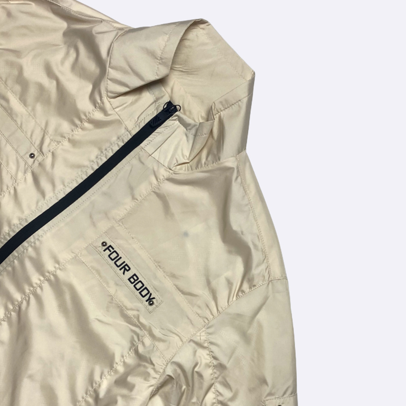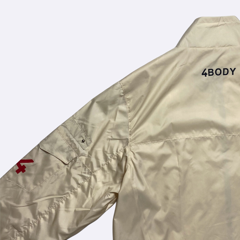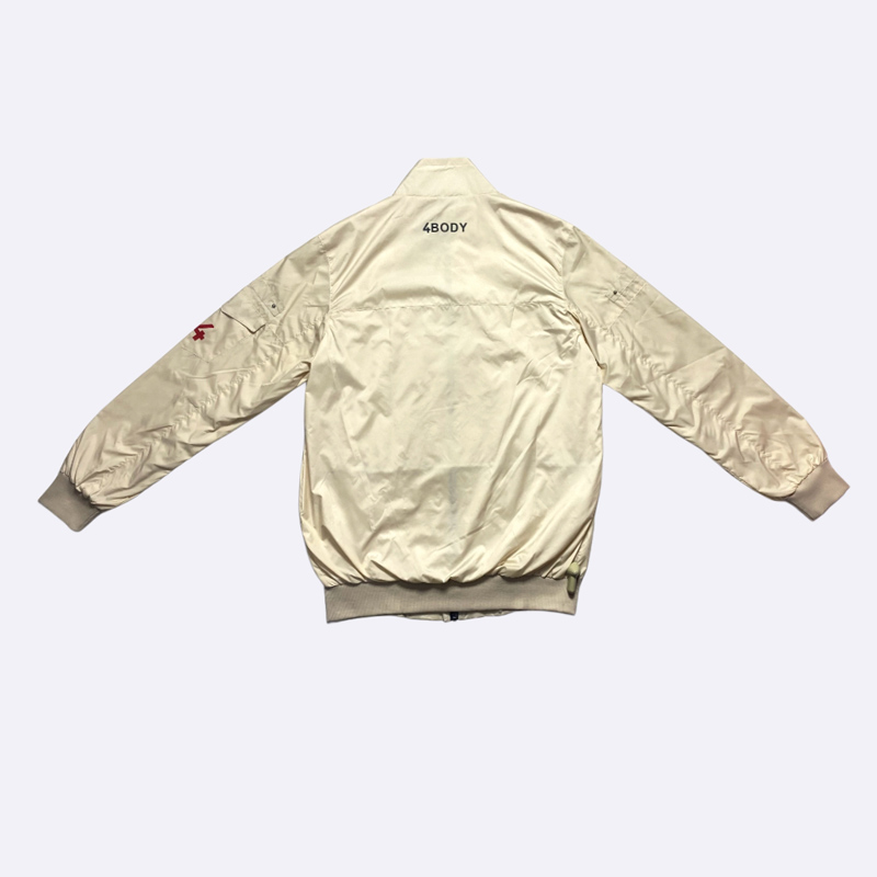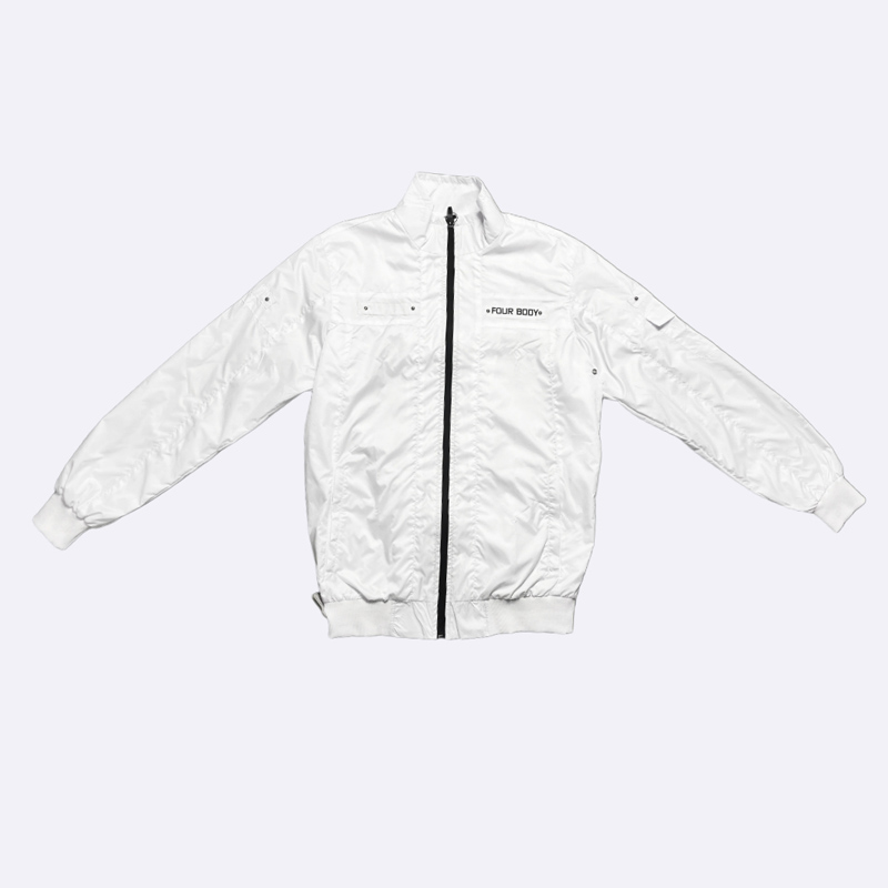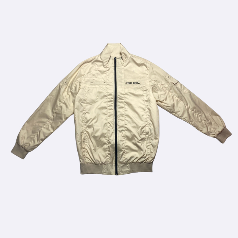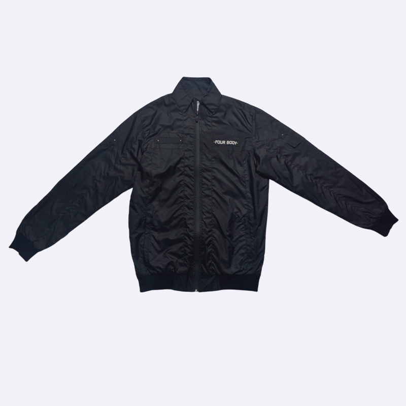 جاكيت بومبر عصري بسحّاب كامل وياقة مرتفعة، يتميز بتصميم عملي مع أكمام وأطراف سفلية مطاطية وجيوب متعددة. الجاكيت مناسب للارتداء اليومي ويحمل علامة "Four Bodd"