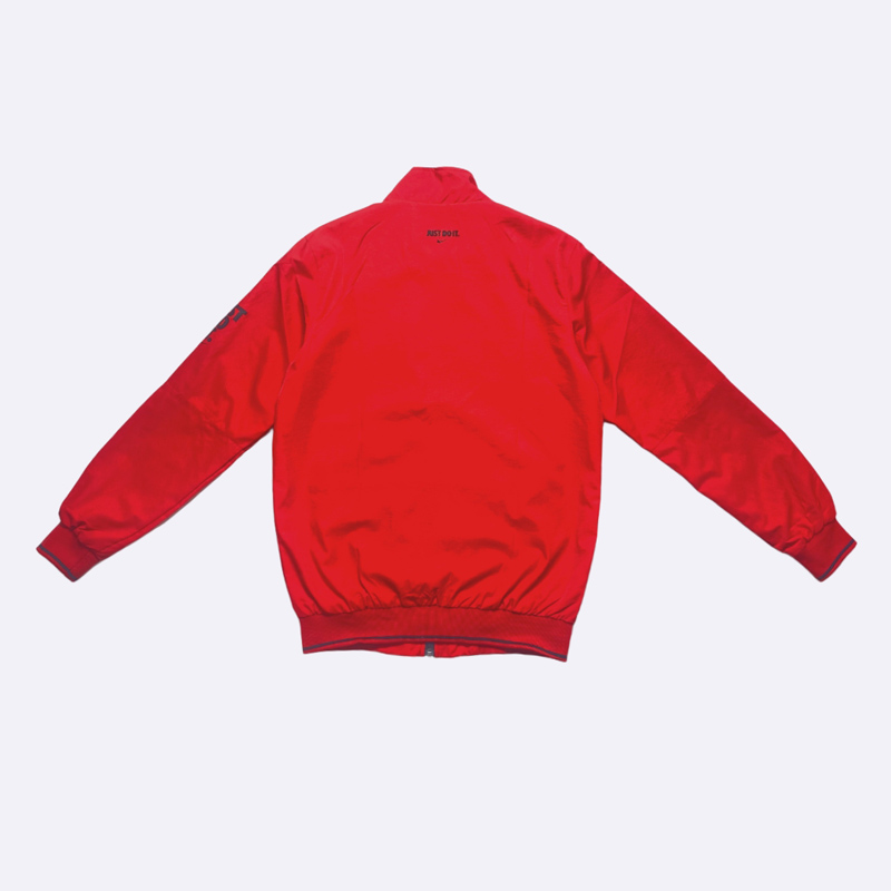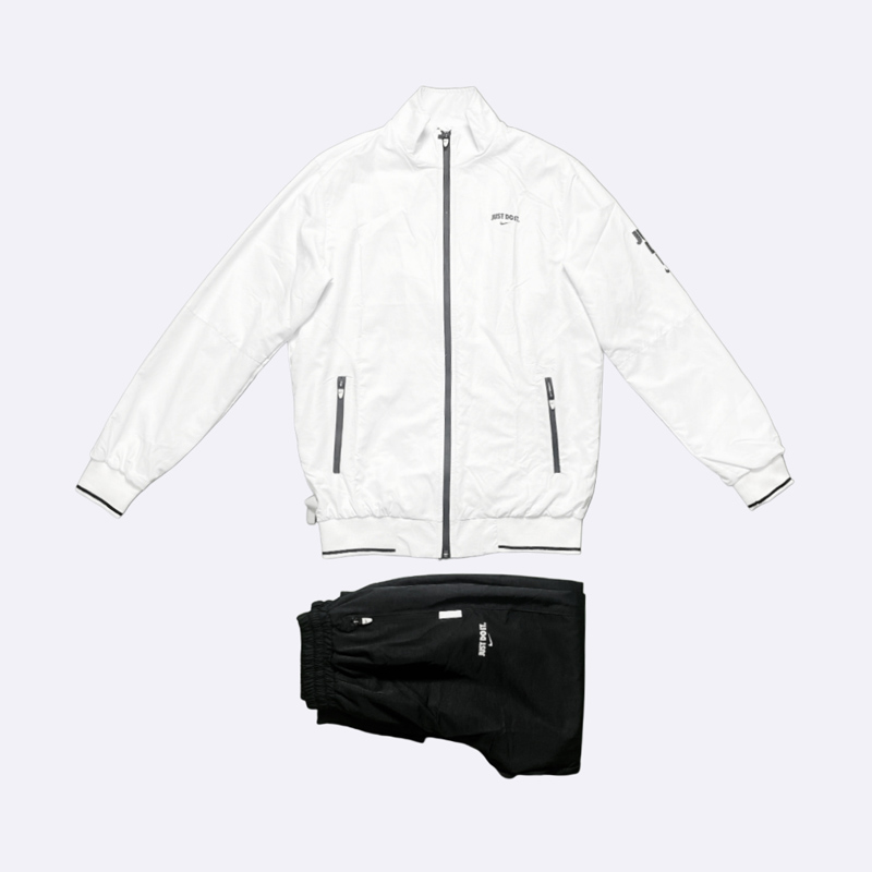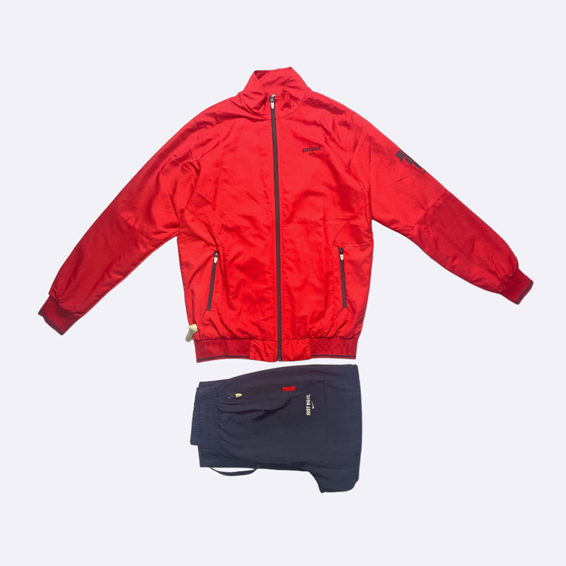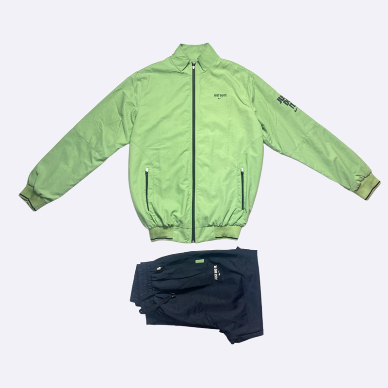 طقم رياضي متكامل يتكون من جاكيت بسحاب كامل وياقة مرتفعة، وبنطال رياضي متناسق. يتميز الجاكيت بجيوب جانبية بسحاب، مما يجعله عملياً ومناسباً للأنشطة الرياضية أو للارتداء اليومي المريح