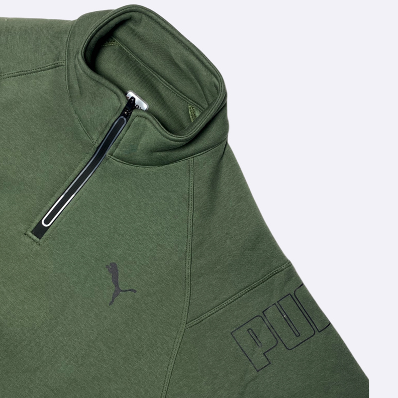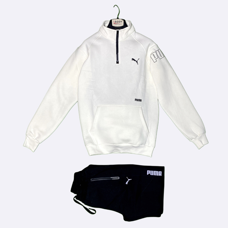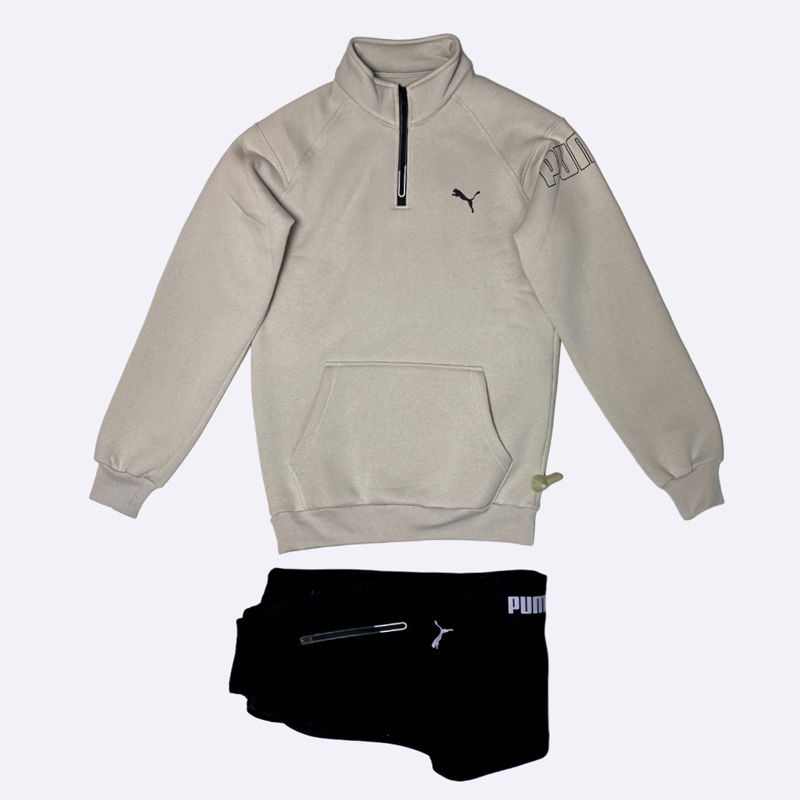 طقم رياضي رجالي من قطعتين يحمل علامة PUMA. يتميز السويت شيرت بياقة مرتفعة وسحاب قصير عند الرقبة وجيب أمامي كبير (كانغارو). البنطلون الرياضي ذو تصميم مريح. الطقم مثالي للتدريب أو الارتداء اليومي في الطقس البارد.
