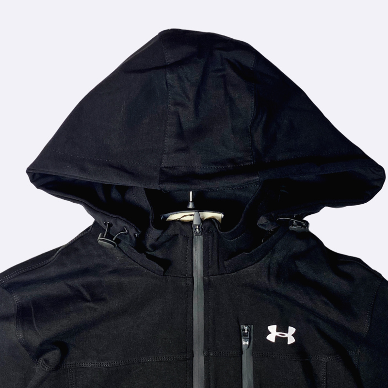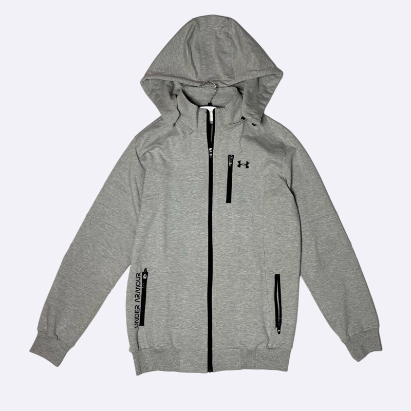 جاكيت هودي (كنزة بسحاب وغطاء رأس) للرجال/الشباب، يتميز بتصميمه الدافئ من قماش الفليس وبسحاب أمامي كامل. يحتوي على جيوب متعددة بسحّابات عمودية وعلامة UNDER ARMOUR المطبوعة على الصدر والذراع. مثالي للتدريب أو للارتداء غير الرسمي في الطقس البارد.