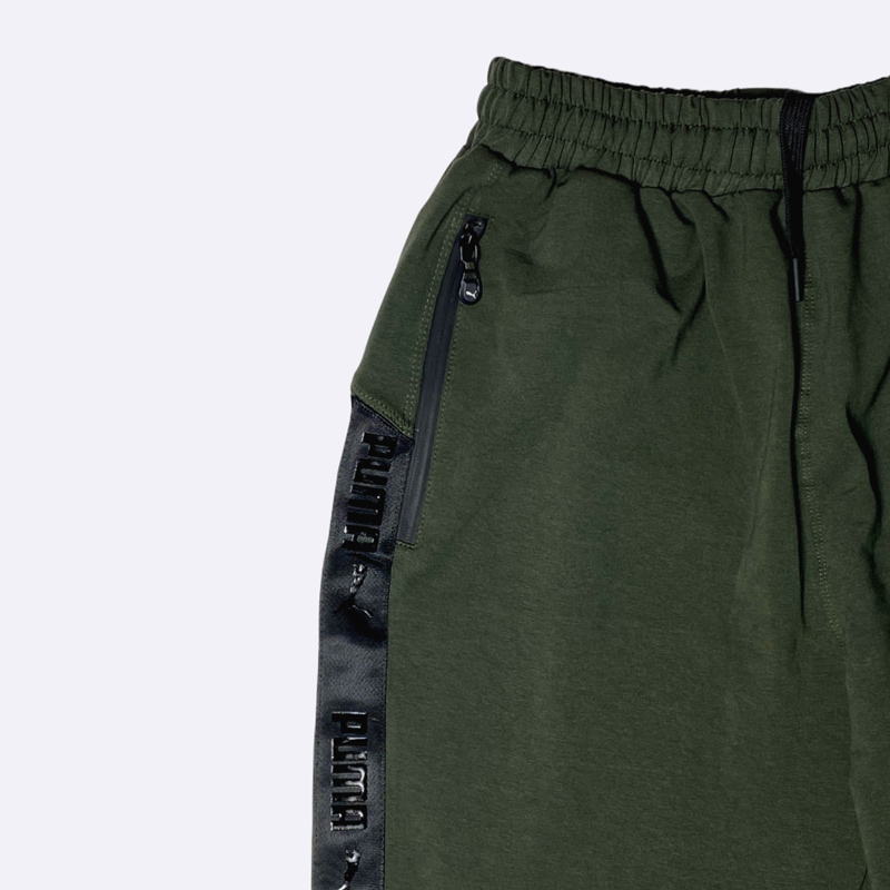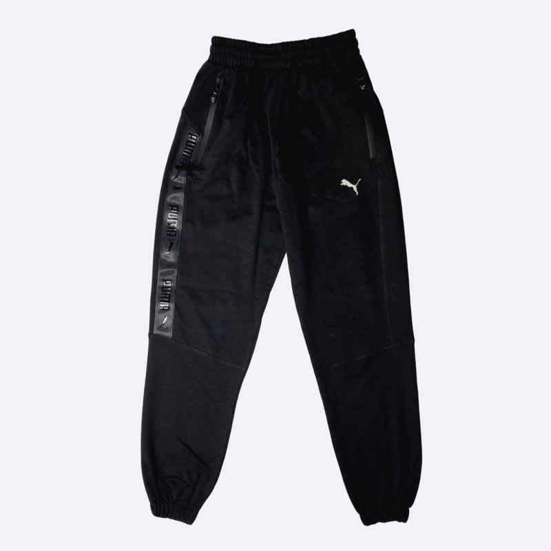 بنطلون رياضي رجالي (جوغر) بتصميم مدبب ومريح. يتميز بخصر مطاطي برباط وجيوب جانبية مزودة بسحّابات، بالإضافة إلى شريط عمودي على الساق يحمل شعار PUMA المطبوع بتصميم جريء. مناسب للتدريب أو الارتداء اليومي العصري