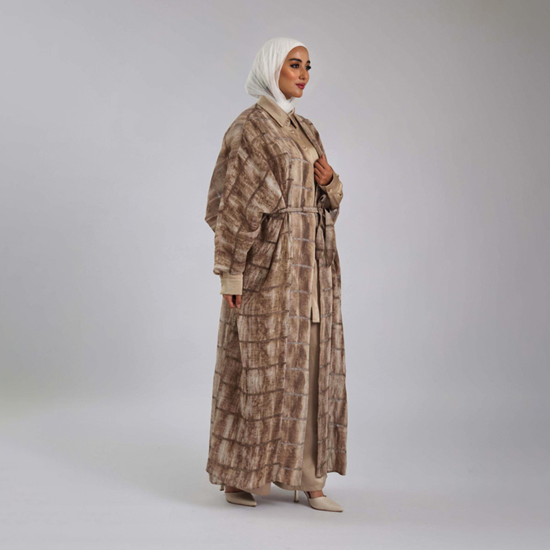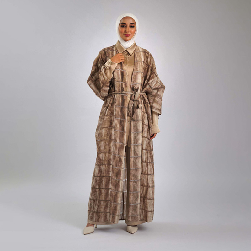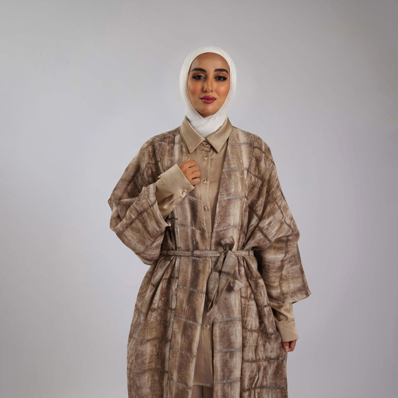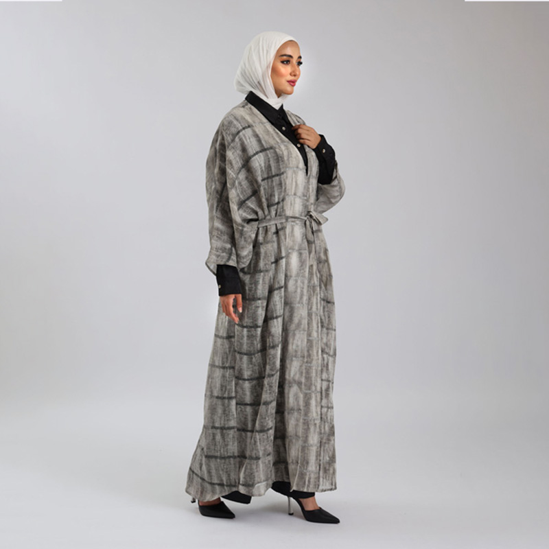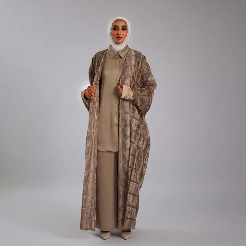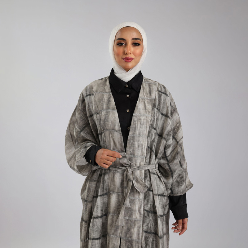 طقم أنيق مكون من عباية طويلة مصممة بقماش الشيفون المصنوع من 100% بوليستر، يتميز بجيوب جانبية وحزام يبرز جمال الخصر. الطقم مثالي للمناسبات الخاصة لإطلالة فريدة ومريحة.