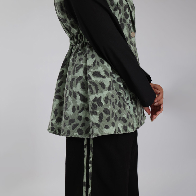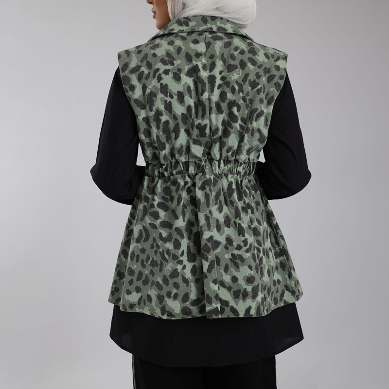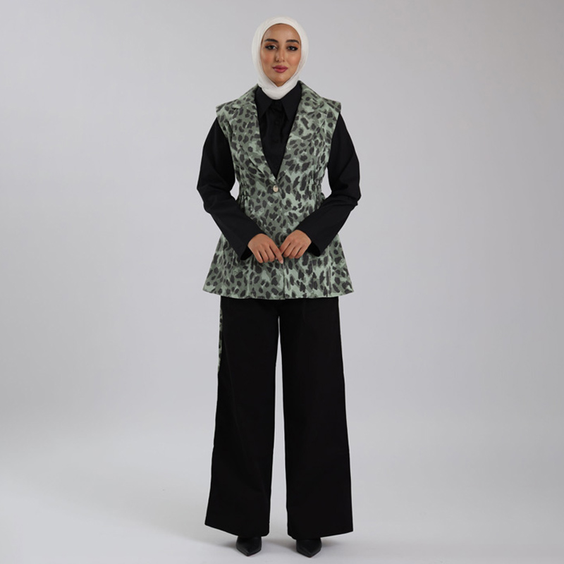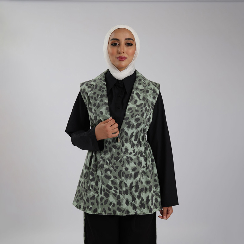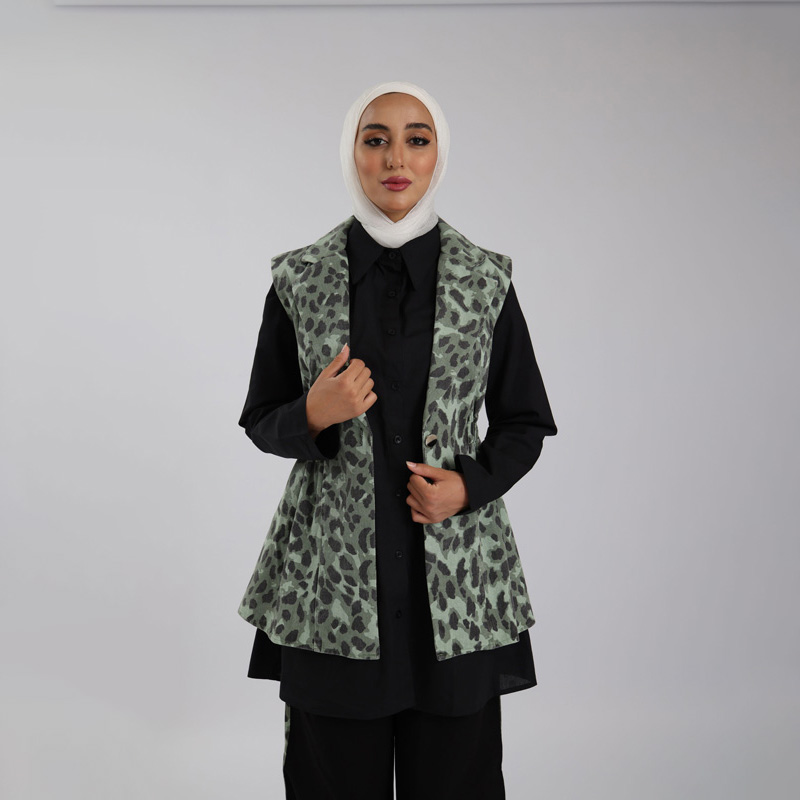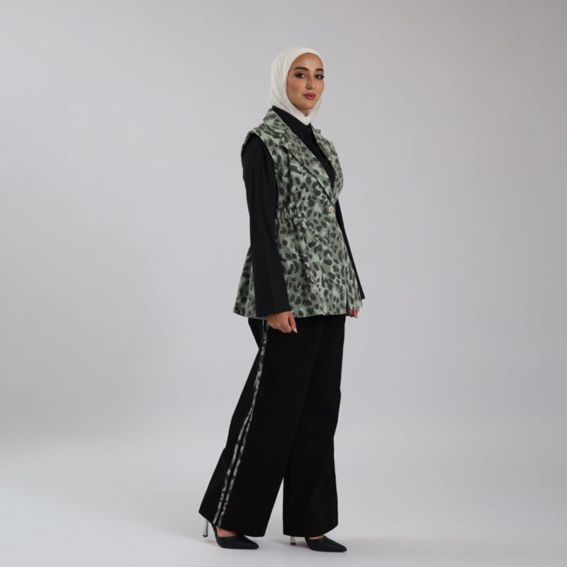 طقم مميز مكون من ثلاث قطع: فيست بتصميم عصري، وقميص، وبنطال واسع. القطع مصنوعة من قماش الريون بنسبة 100% لتوفير الراحة. الطقم مثالي لإطلالة أنيقة وعملية في آن واحد.