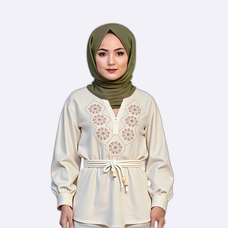 بلوزة أنيقة بتصميم واسع ومريح، تتميز برقبة على شكل حرف V مع تطريزات دائرية متقنة حولها، وحزام قماشي عند الخصر يربط بحبل رفيع لإضفاء لمسة جمالية. الأكمام طويلة وتنتهي بأساور ضيقة.