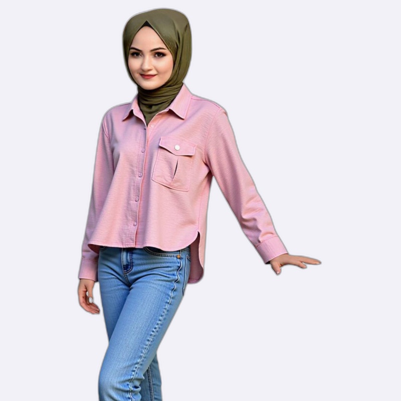 بلوزة أنيقة بتصميم واسع ومريح، تتميز برقبة على شكل حرف V مع تطريزات دائرية متقنة حولها، وحزام قماشي عند الخصر يربط بحبل رفيع لإضفاء لمسة جمالية. الأكمام طويلة وتنتهي بأساور ضيقة.