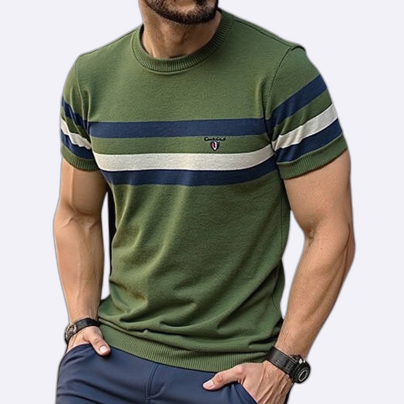 تي شيرت رجالي بتصميم كاجوال وعصري، يتميز بياقة مستديرة وأكمام قصيرة. التي شيرت مزين بطبعة بسيطة وواضحة على الصدر. يتوفر هذا المنتج بألوان أنيقة ومتناسقة تشمل الزيتي والموف والكحلي.