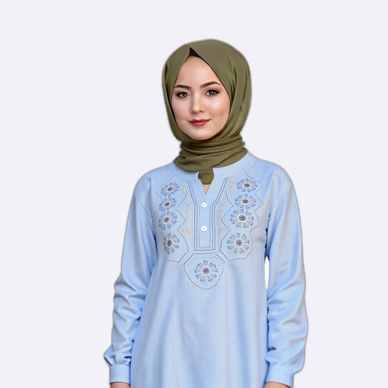 بلوزة أنيقة بتصميم واسع ومريح، تتميز برقبة على شكل حرف V مع تطريزات دائرية متقنة حولها، وحزام قماشي عند الخصر يربط بحبل رفيع لإضفاء لمسة جمالية. الأكمام طويلة وتنتهي بأساور ضيقة