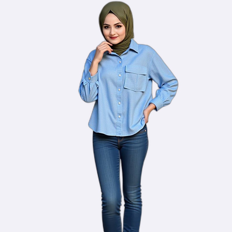 بلوزة أنيقة بتصميم واسع ومريح، تتميز برقبة على شكل حرف V مع تطريزات دائرية متقنة حولها، وحزام قماشي عند الخصر يربط بحبل رفيع لإضفاء لمسة جمالية. الأكمام طويلة وتنتهي بأساور ضيقة