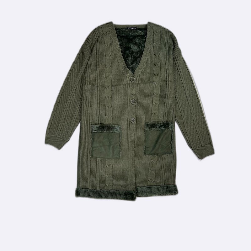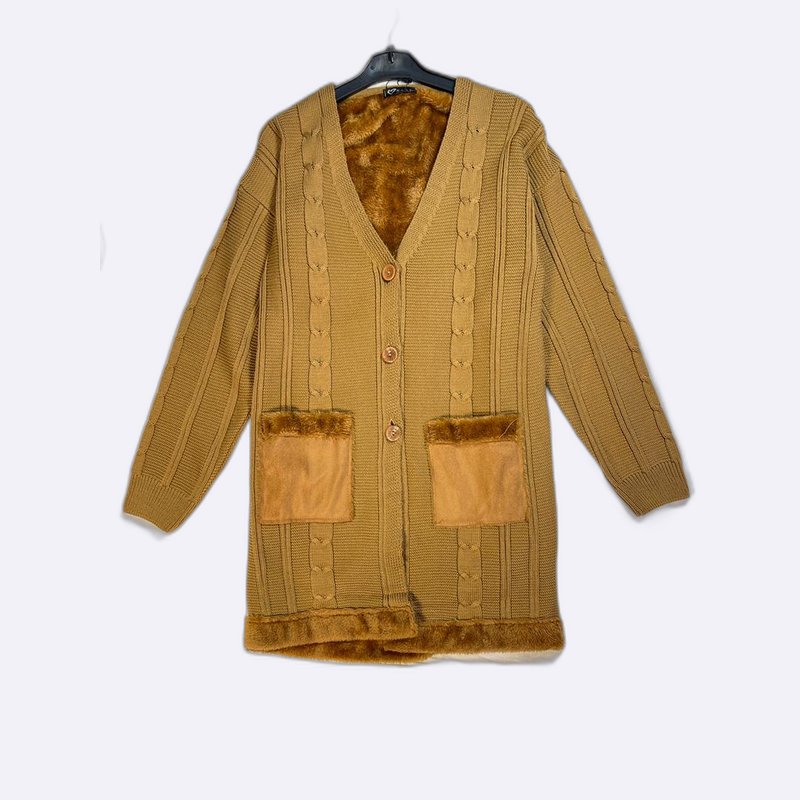 استمتعي بالدفء والأناقة مع هذا الكارديجان المحبوك ببطانة قطيفة ناعمة. تصميم عصري ومريح يضفي لمسة فخامة على إطلالتك الشتوية.