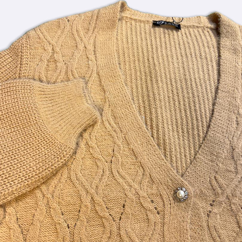 أضيفي لمسة من الأناقة إلى مظهرك مع هذا الكارديجان المحبوك. يتميز بأزرار لؤلؤية وياقة على شكل حرف V، مما يجعله مثاليًا لكل مناسبة.
