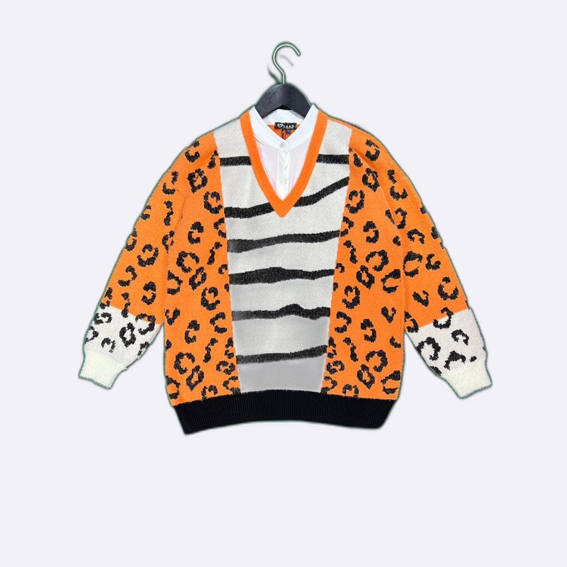تألقي بإطلالة عصرية وجريئة مع هذا الطقم المكون من كنزة بنقشة جلد النمر وقميص أبيض أنيق. تصميم فريد يضفي لمسة مميزة على مظهرك.
