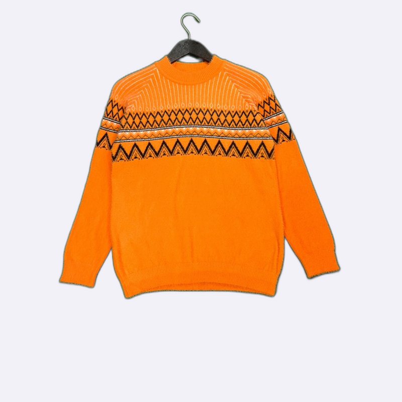 تألقي بإطلالة عصرية مع هذه الكنزة البرتقالية بنقشة هندسية مستوحاة من الطراز القديم. تصميم مريح وأنيق يضفي لمسة مميزة على مظهرك.