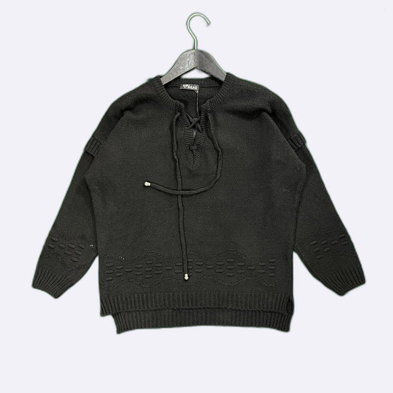 استمتعي بإطلالة عصرية ومريحة مع هذه الكنزة التريكو الأنيقة. تصميم فريد برباط يضفي لمسة جمالية، مثالية لأيامك الكاجوال.
